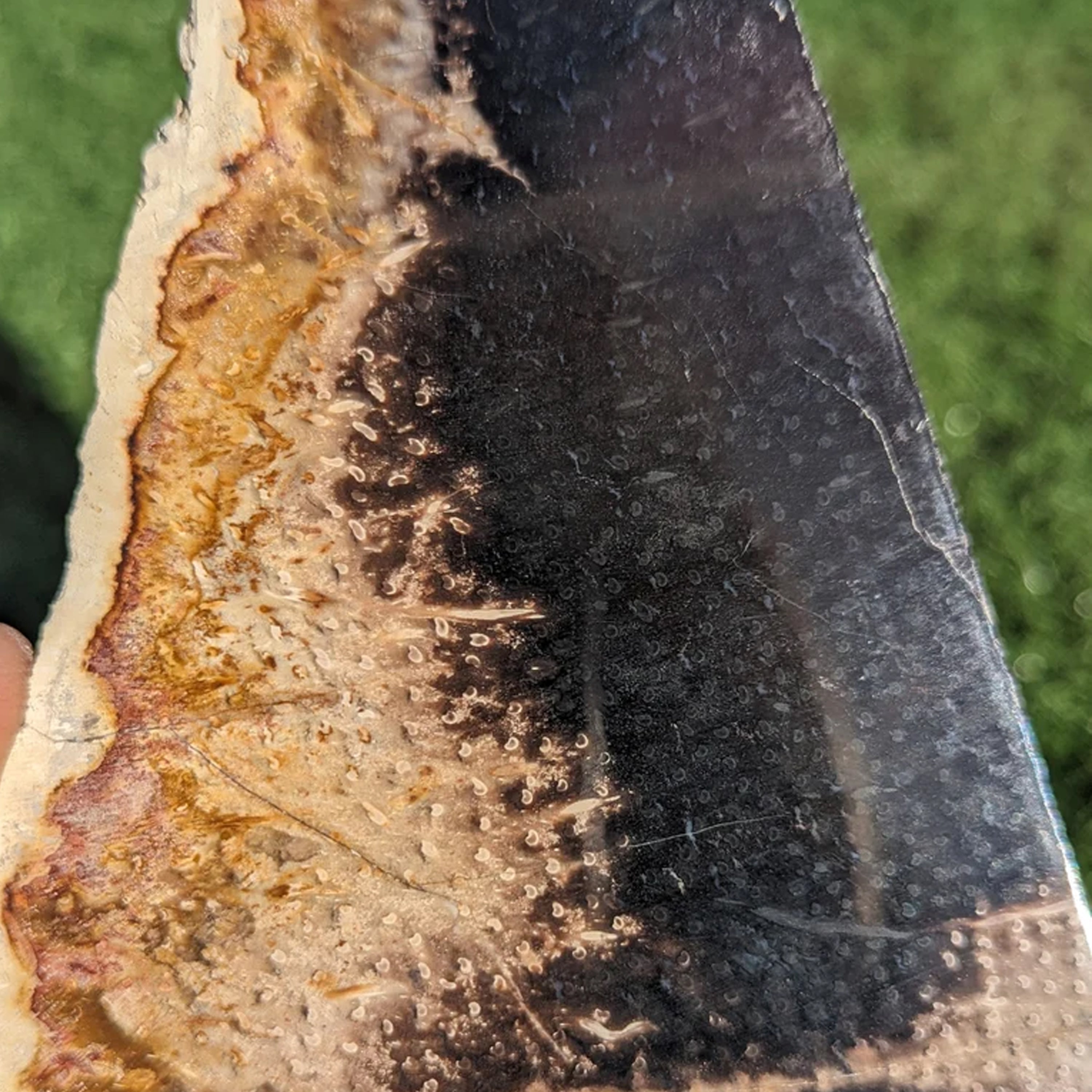 Petrified Palm Root can exhibit a variety of colors, including browns, tans, reds, and oranges, and often features intricate patterns and textures that resemble wood grain.