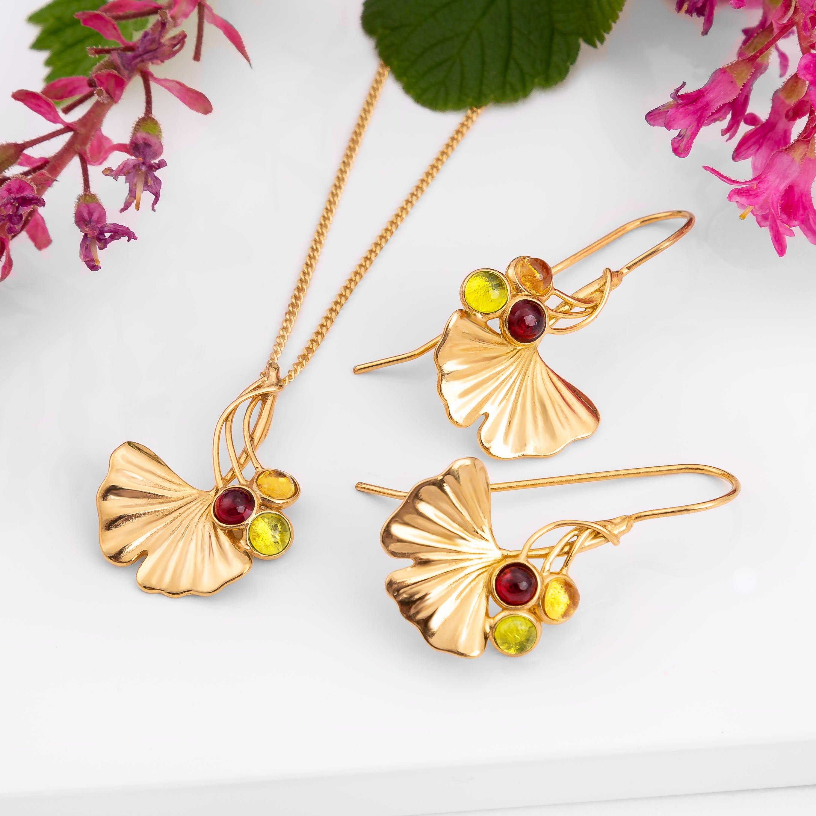 Inspired by oriental nature, our Silver with 24ct Gold and Garnet, Peridot & Citrine Ginkgo Flower Hook Earrings are beautifully unique.