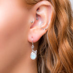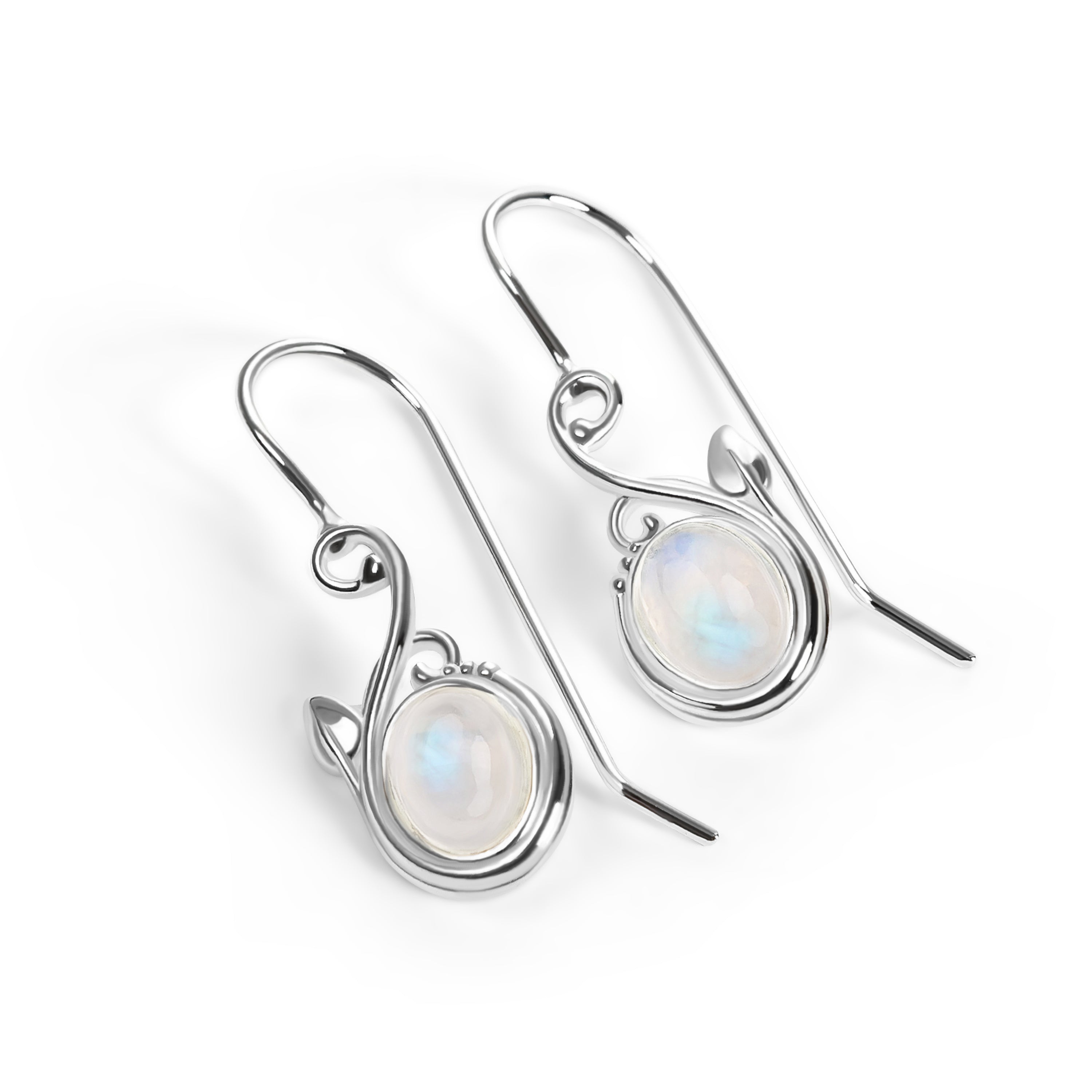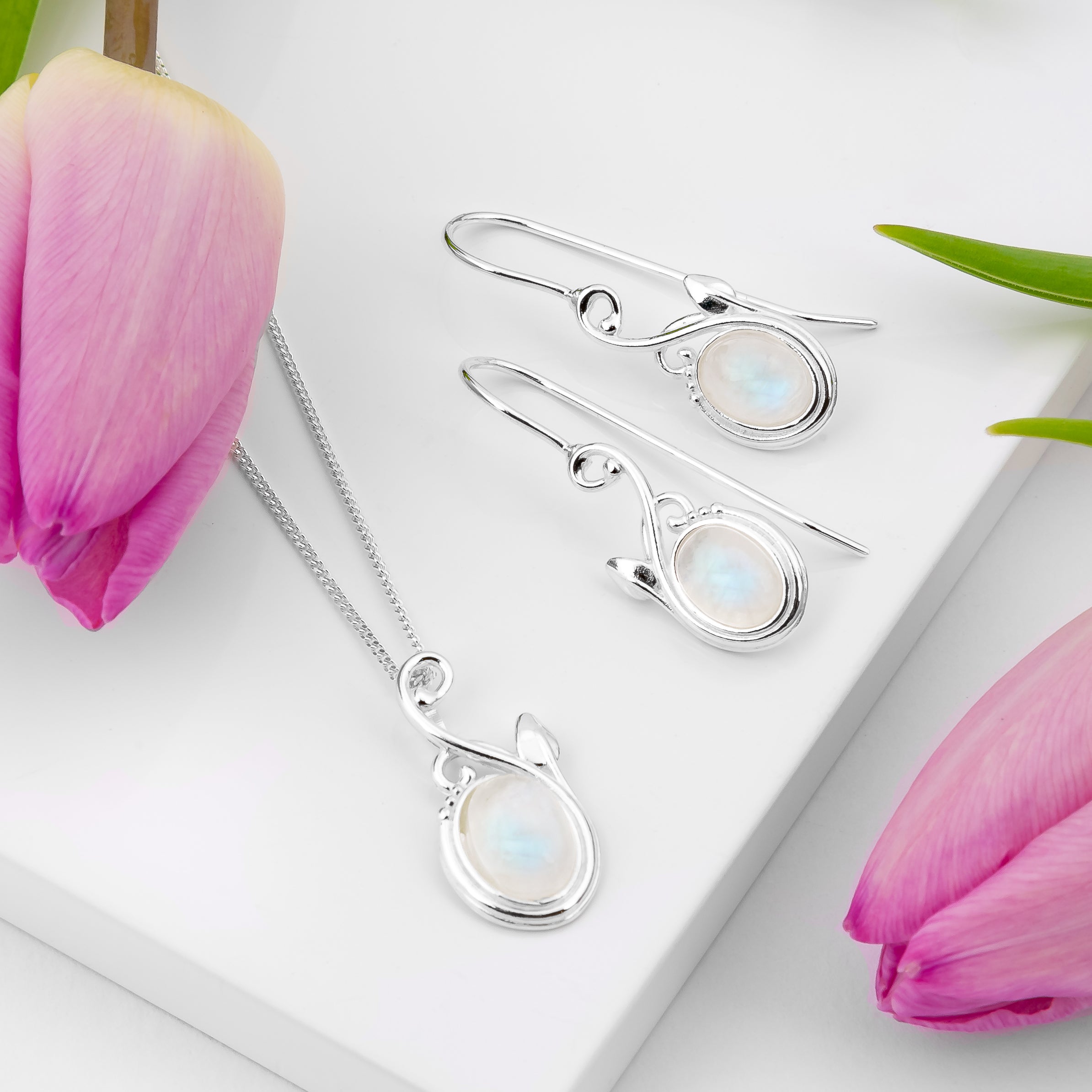 Crafted in 925 silver, each earring is adorned with an oval genuine Moonstone gemstone encased in silver with leaf detailing decorating the outside. Finished with a solid silver hook for comfortable all day wearing.