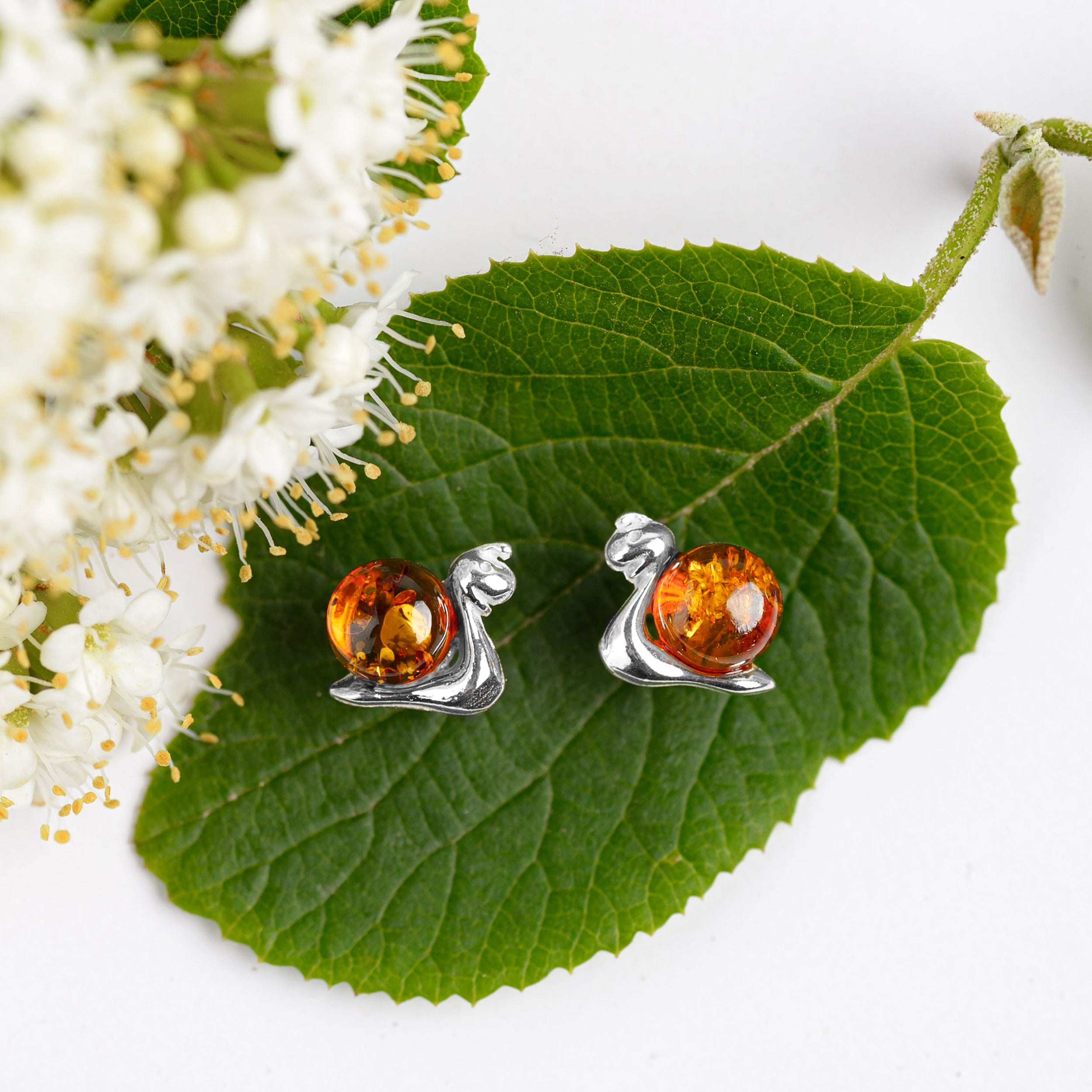Crafted in 925 silver, each earring has a single genuine Baltic Amber gemstone to represent the round shell of the snail. Finished with a solid silver stem and a butterfly back fitting for secure wearing all day long.