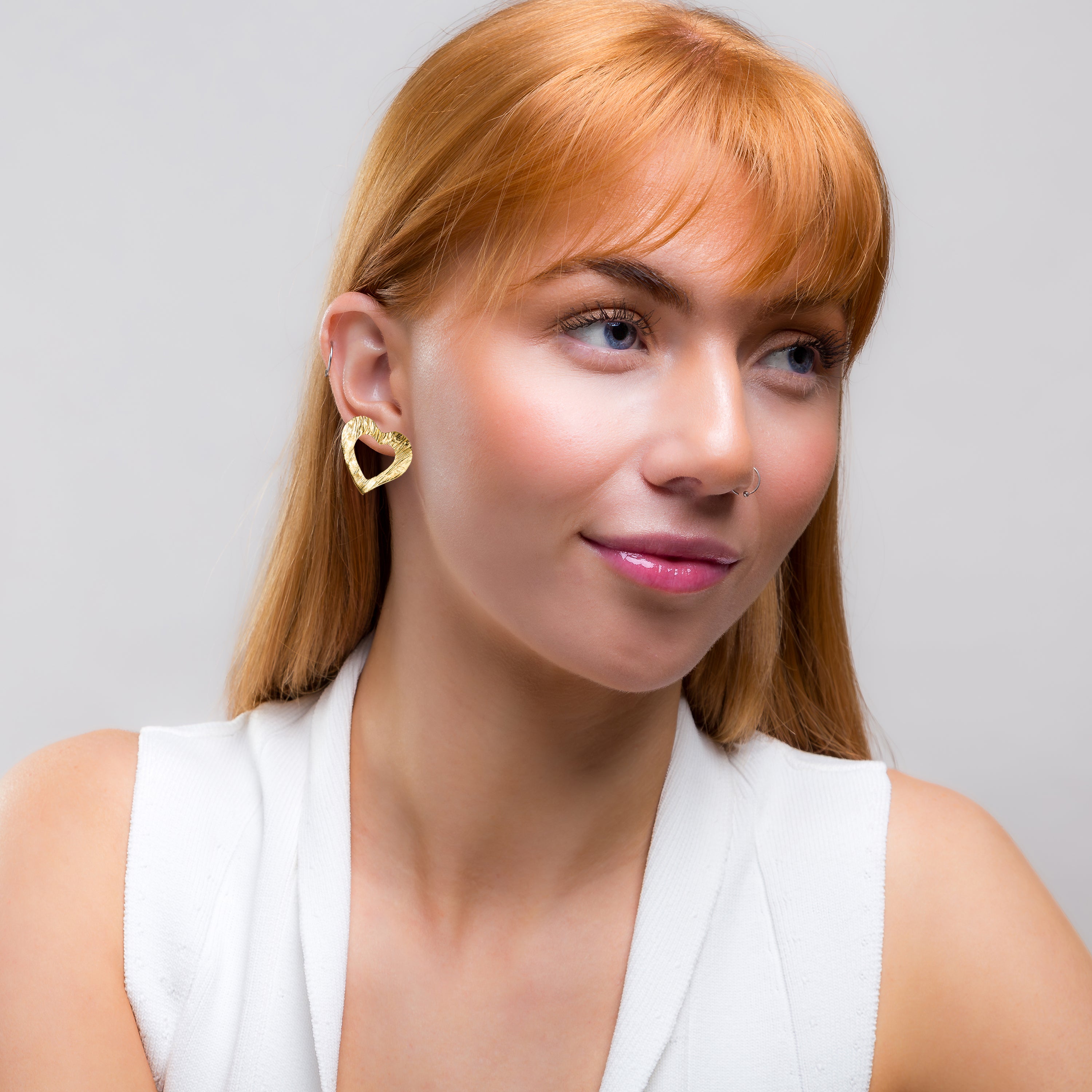 Statement Textured Open Heart Stud Earrings in Silver with 24ct Gold
