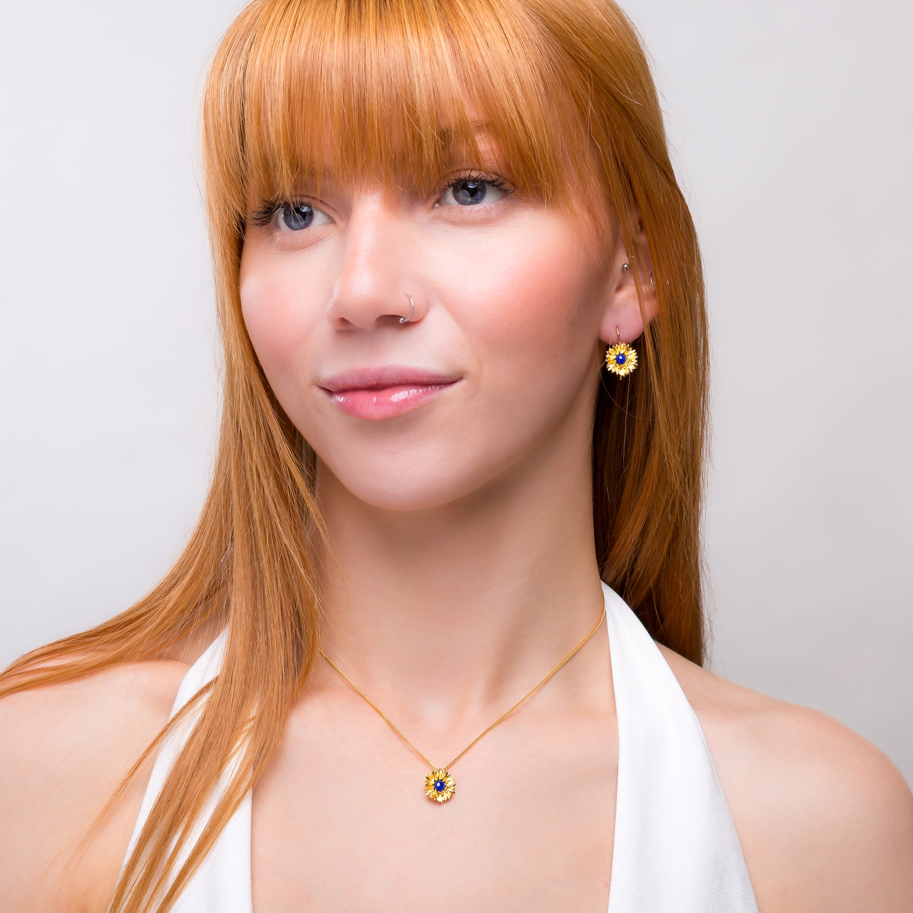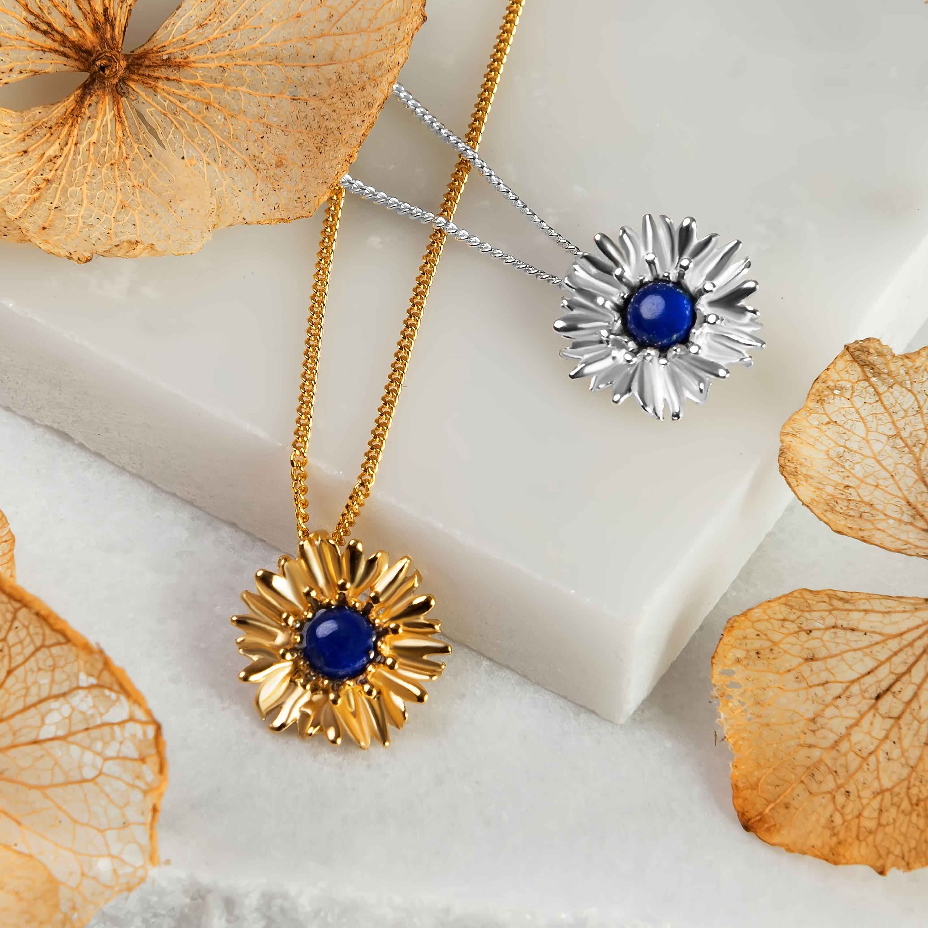 Crated in solid 925 silver finished in 24ct Gold and centred with a single genuine Lapis Lazuli gemstone to represent the famous 'blue' of this much loved flower. Finished with carefully designed and detailed petals, this necklace is sweet and subtle. Complete with a silver chain, it's perfect for brightening up your every day outfit.