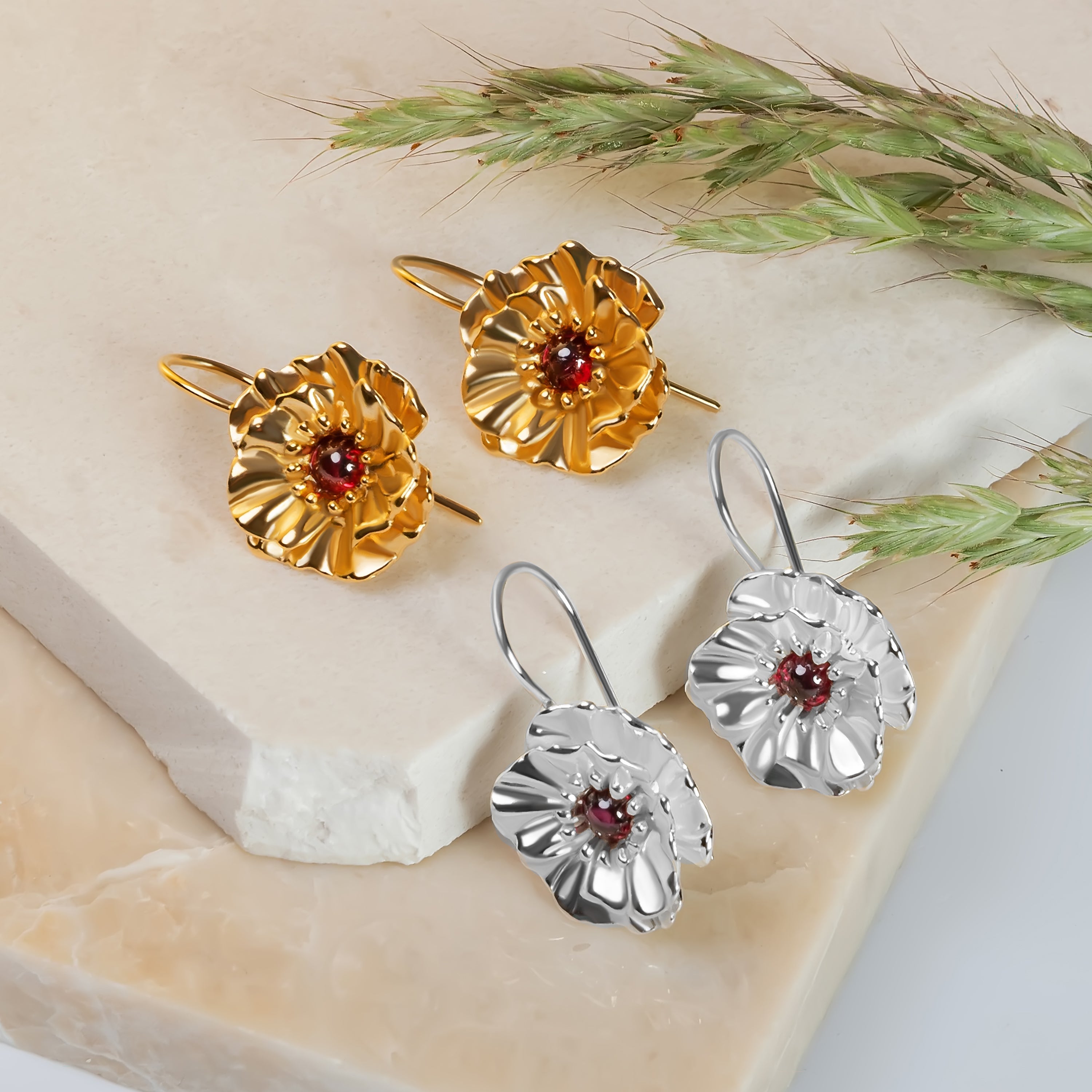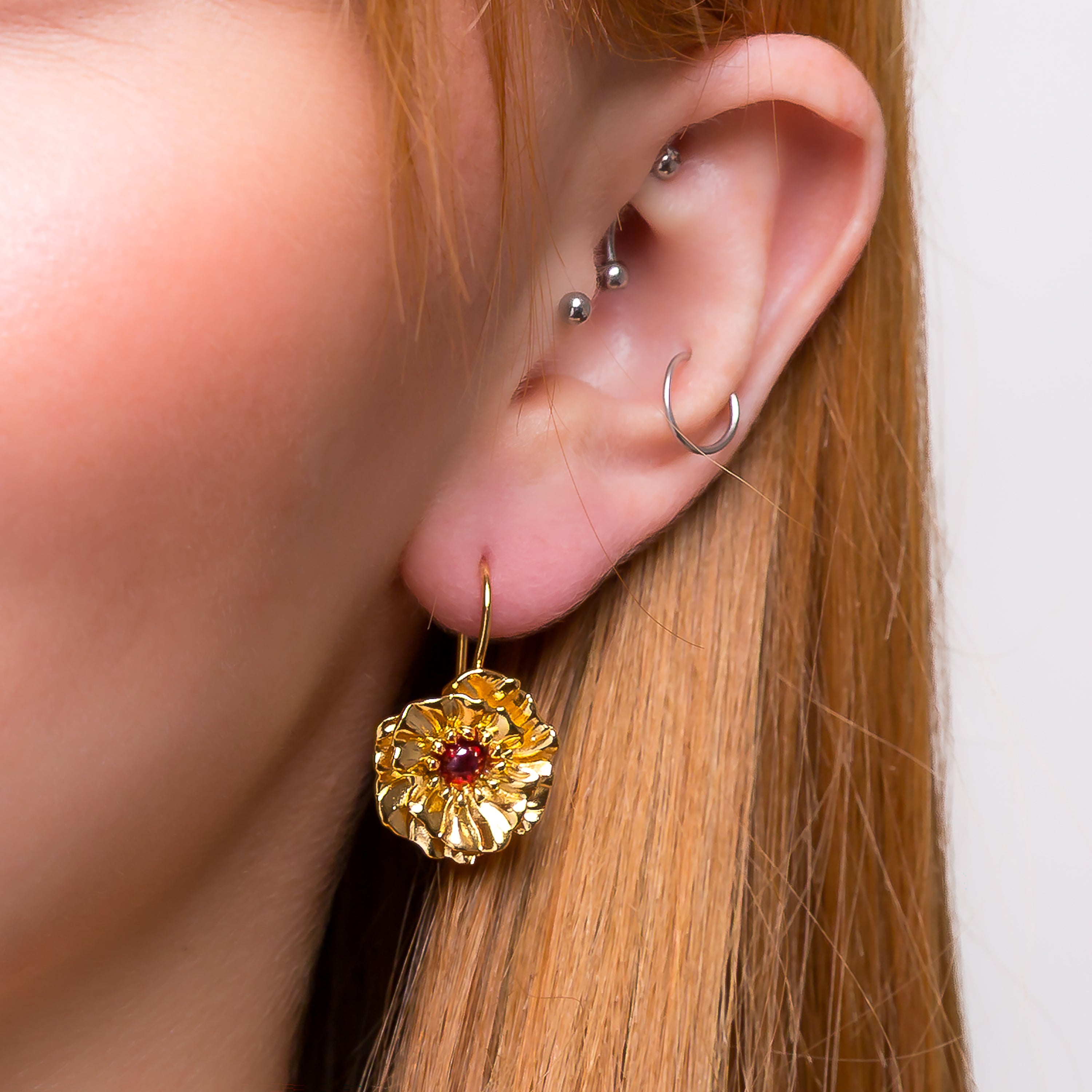 Crafted in 925 silver and finished in 24ct Gold each earring has a single natural red Garnet gemstone at the centre of the flower and carefully silver detailed petals. Each earring is finished with a solid silver hook fitting.
