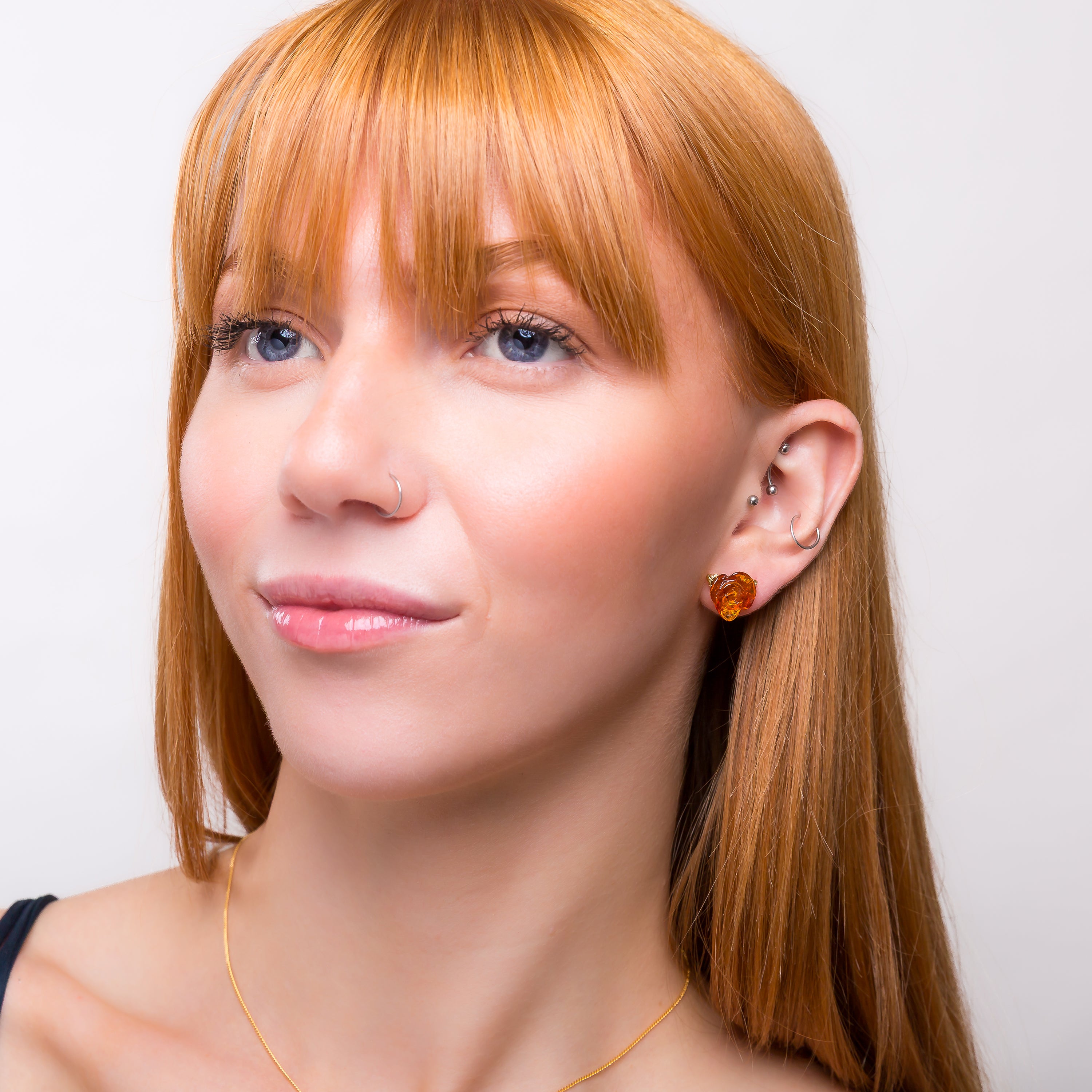 Handcrafted in 925 Silver and finished in 24ct Gold, each earrings is adorned with a genuine Baltic Amber gemstone which has been carefully carved into a fully bloomed rose. Surrounded by a silver detailed bud which holds the flower perfectly. Complete with solid silver stem posts and butterfly backs for secure wearing all day.