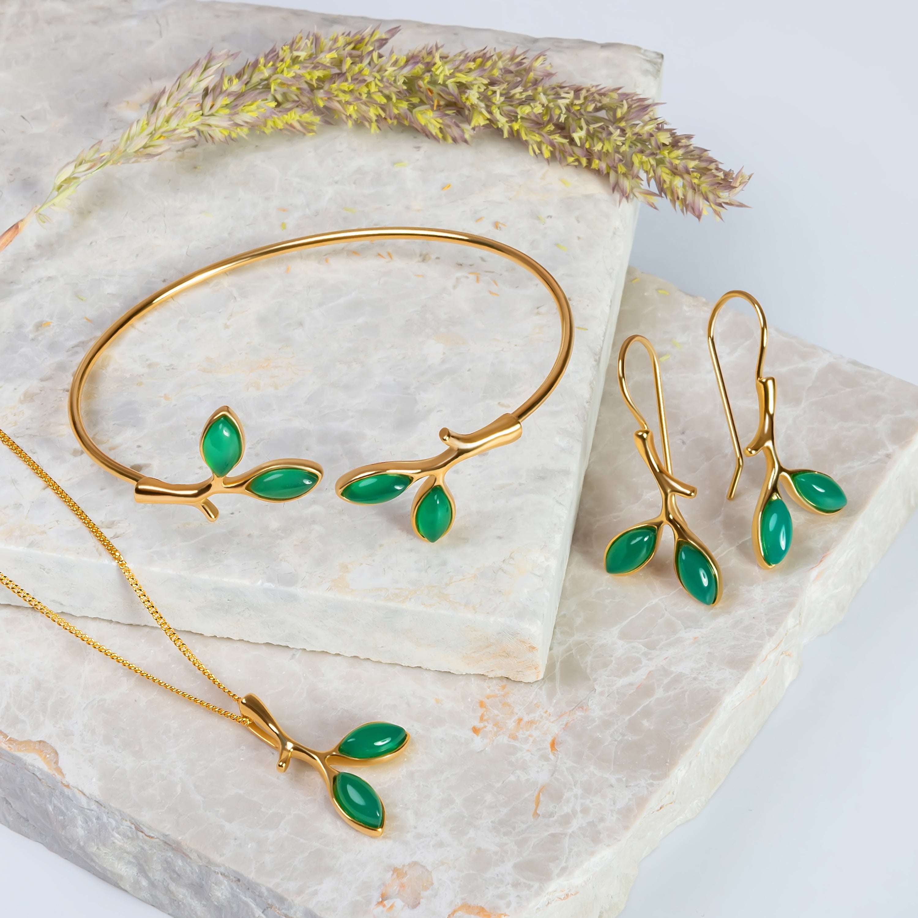 Achieve that nature inspired look with our Silver with 24ct Gold and Green Onyx Olive Leaf Branch Bangle.
