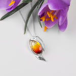 Handcrafted 925 silver this pendant is adorned with a single teardrop shaped genuine Baltic Amber gemstone which has been heat treated to create the two tone colour. Set into a silver mount creating the look of a blooming tulip. Complete with a solid silver chain.