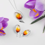 Set in 925 silver, each earring is adorned with a marquise shaped genuine Baltic Amber gemstone which has been set into a silver mount creating the look of a blooming tulip flower.