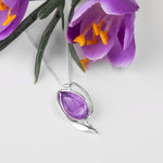 Handcrafted 925 silver this pendant is adorned with a single teardrop shaped natural Amethyst gemstone which has been set into a silver mount creating the look of a blooming tulip. Complete with a solid silver chain.
