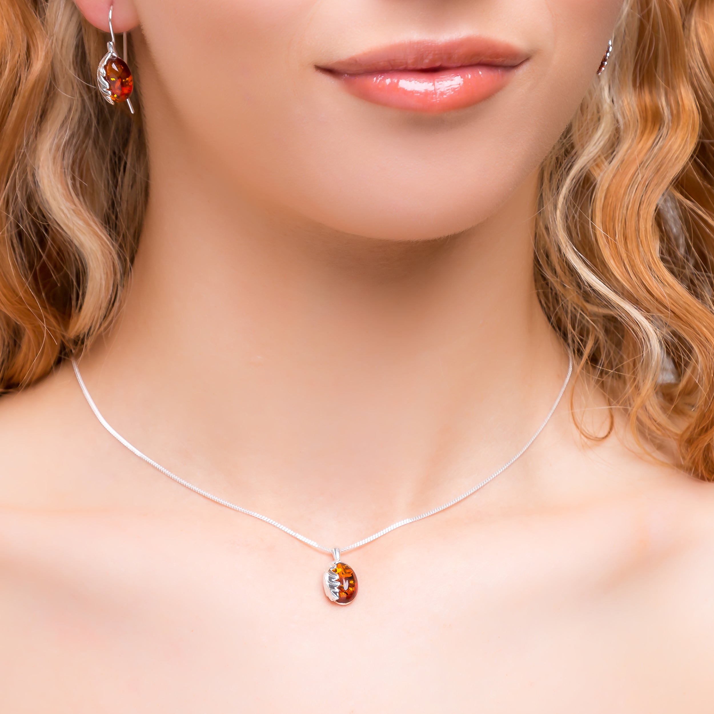 Leaf Motif Hook Earrings in Silver and Cognac Amber