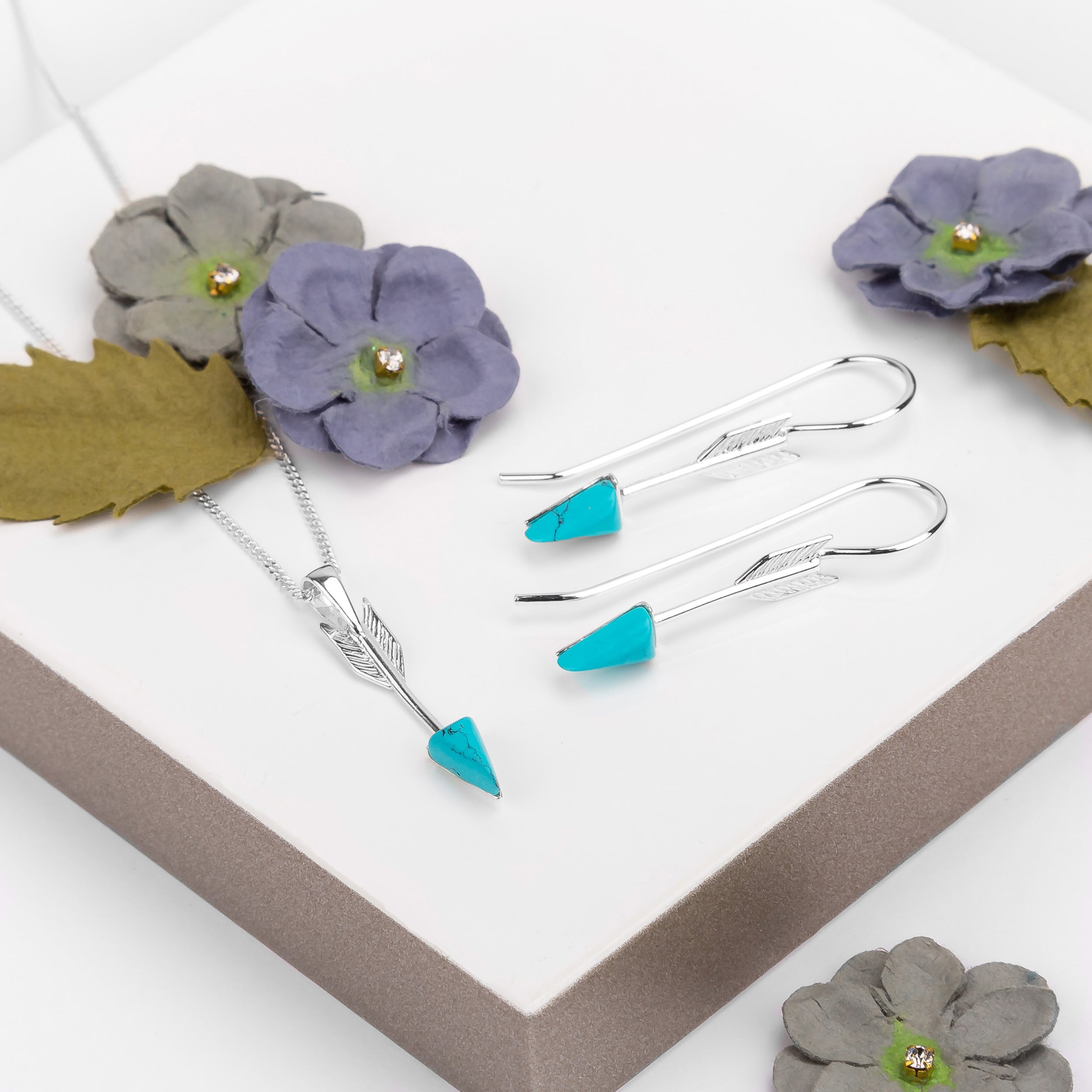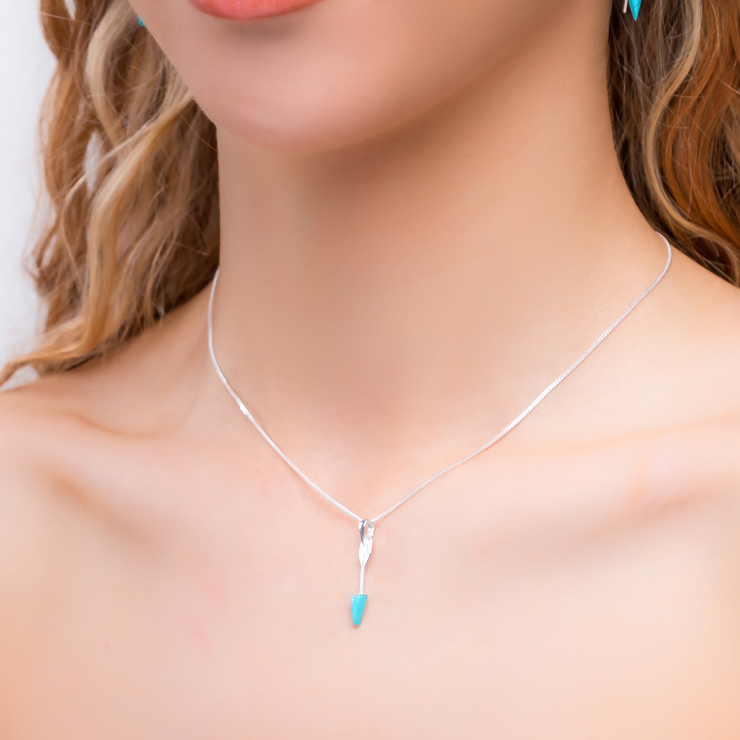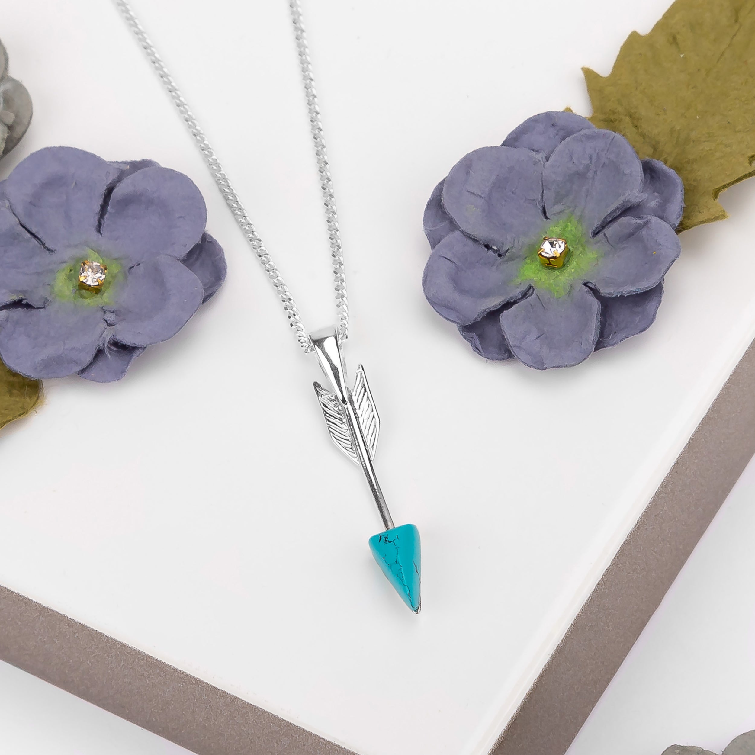 The Arrow Necklace is crafted in solid 925 silver with a matching silver chain. The tip of the arrow is set with a perfectly triangular piece of vibrant blue Turquoise stone. Comes complete with a silver curb chain.