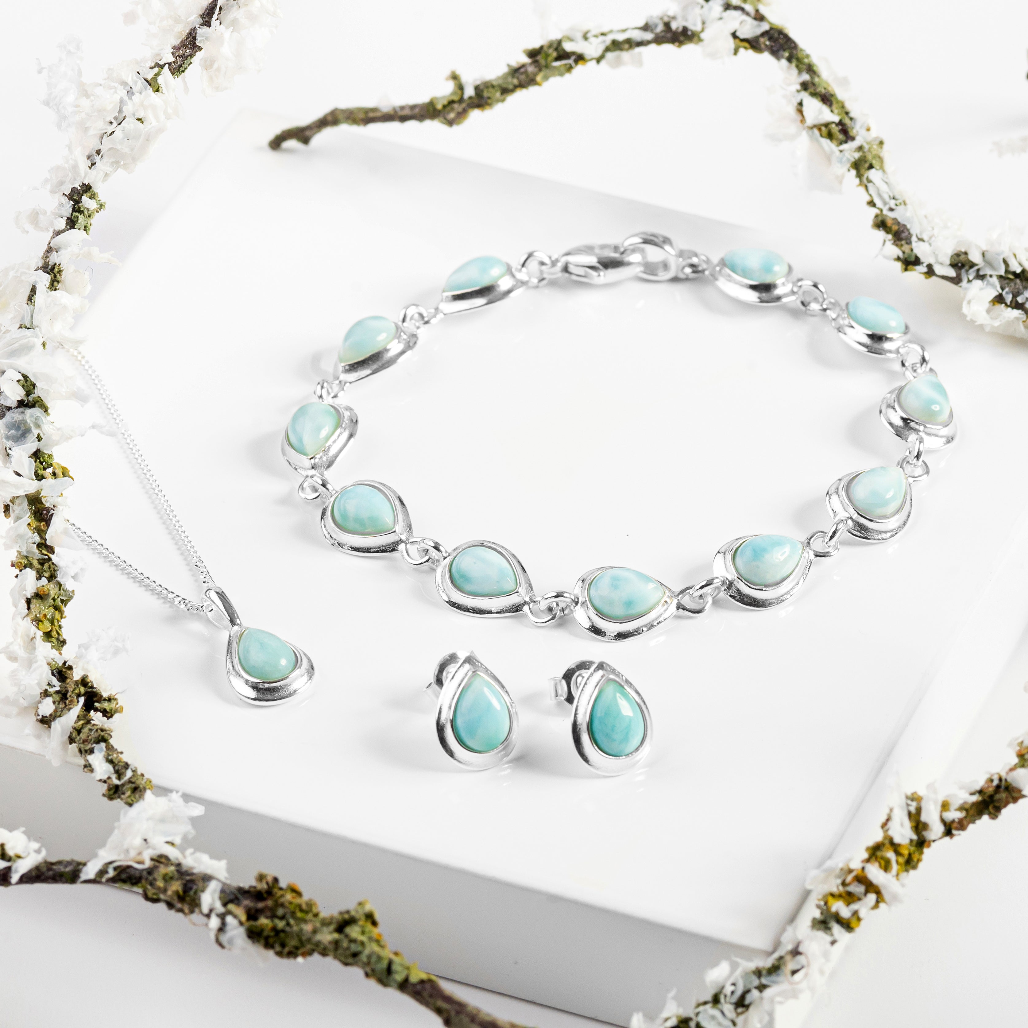 Handcrafted in solid 925 silver, this bracelet is adorned with 11 tranquil Larimar gemstones which have been carefully cut and polished into a teardrop shape. Each stone is set and linked together in silver.