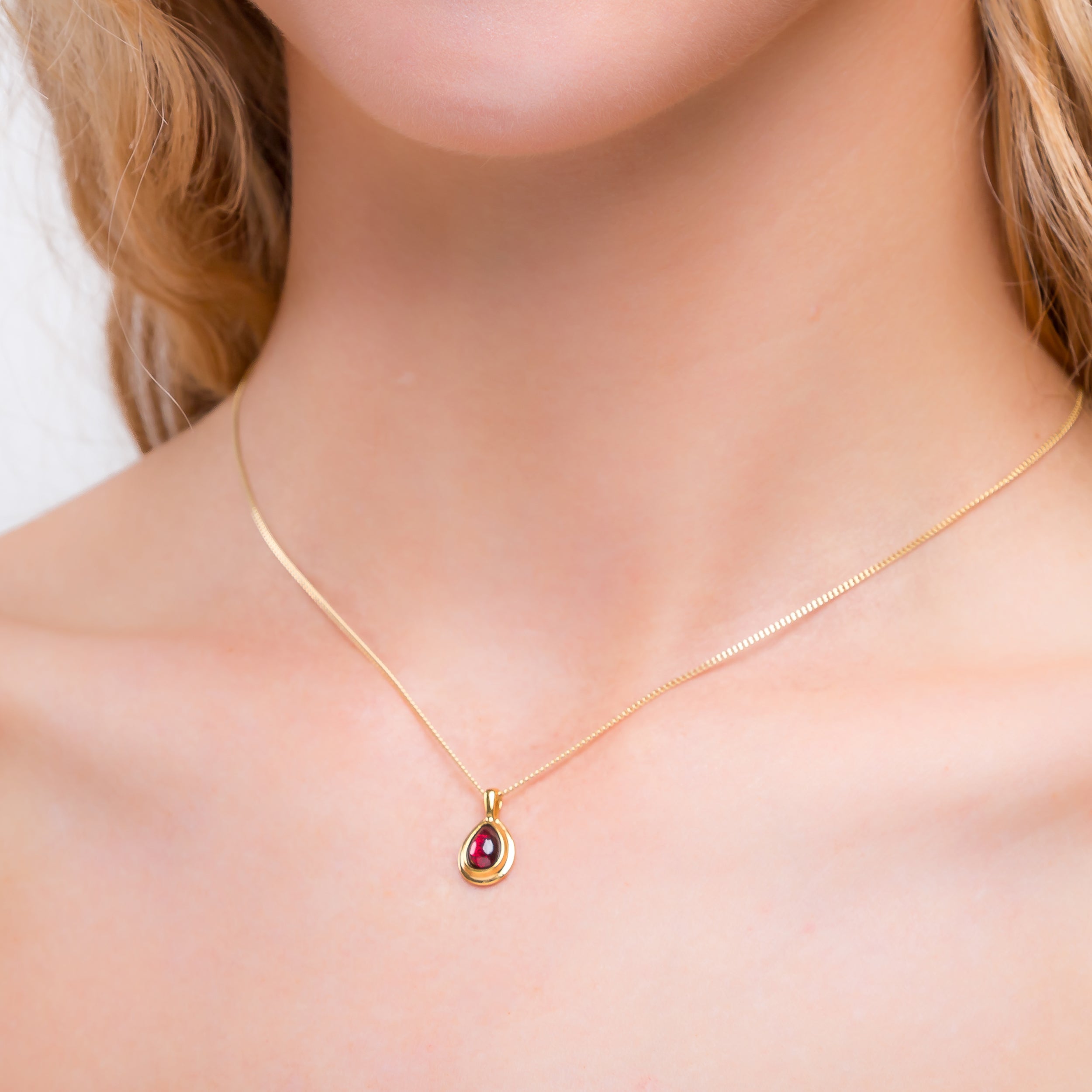 Crafted in a teardrop shape, the natural red Garnet gemstone is set into a 24ct Gold plated mount. With a gold plated chain, it completes this necklace perfectly to suit every occasion.