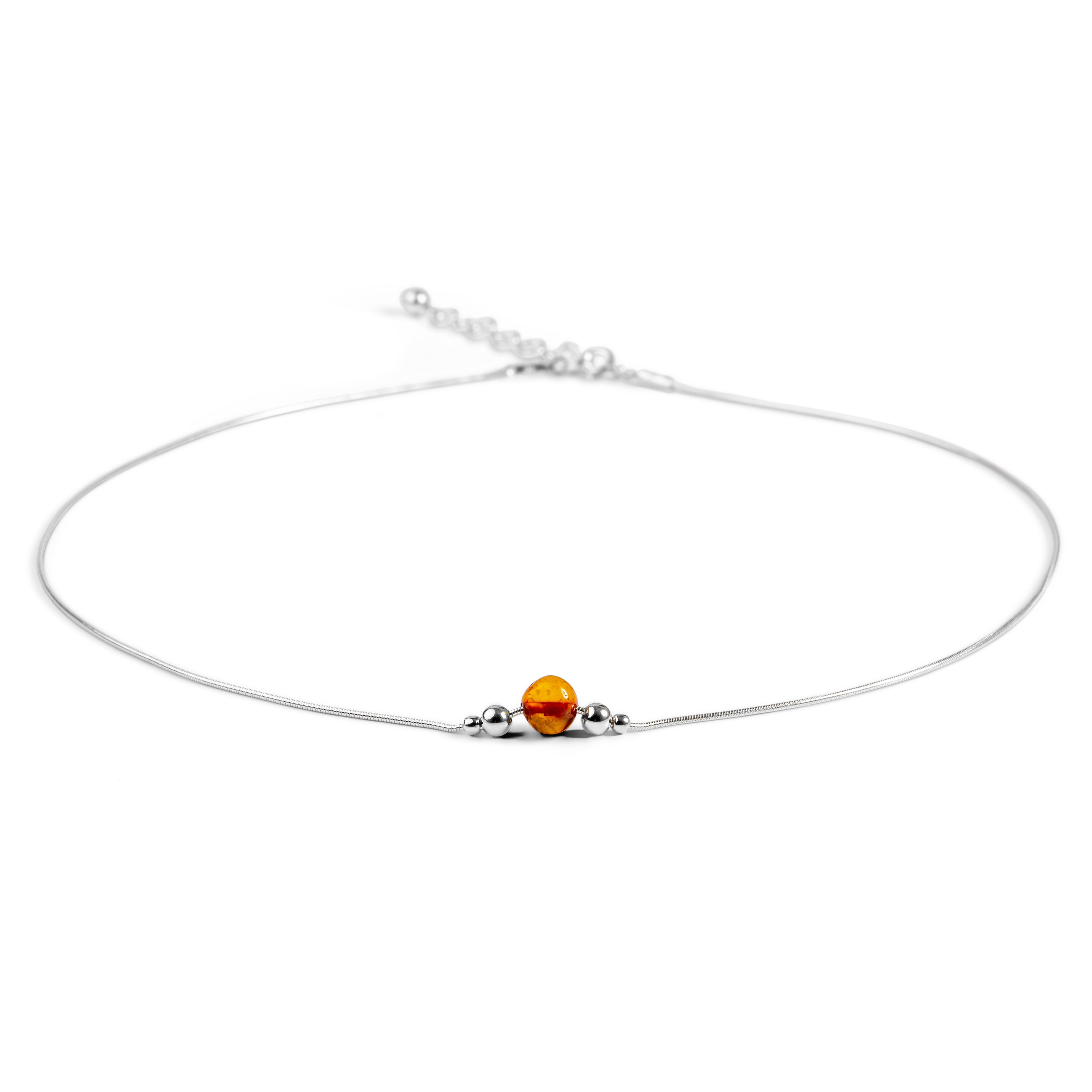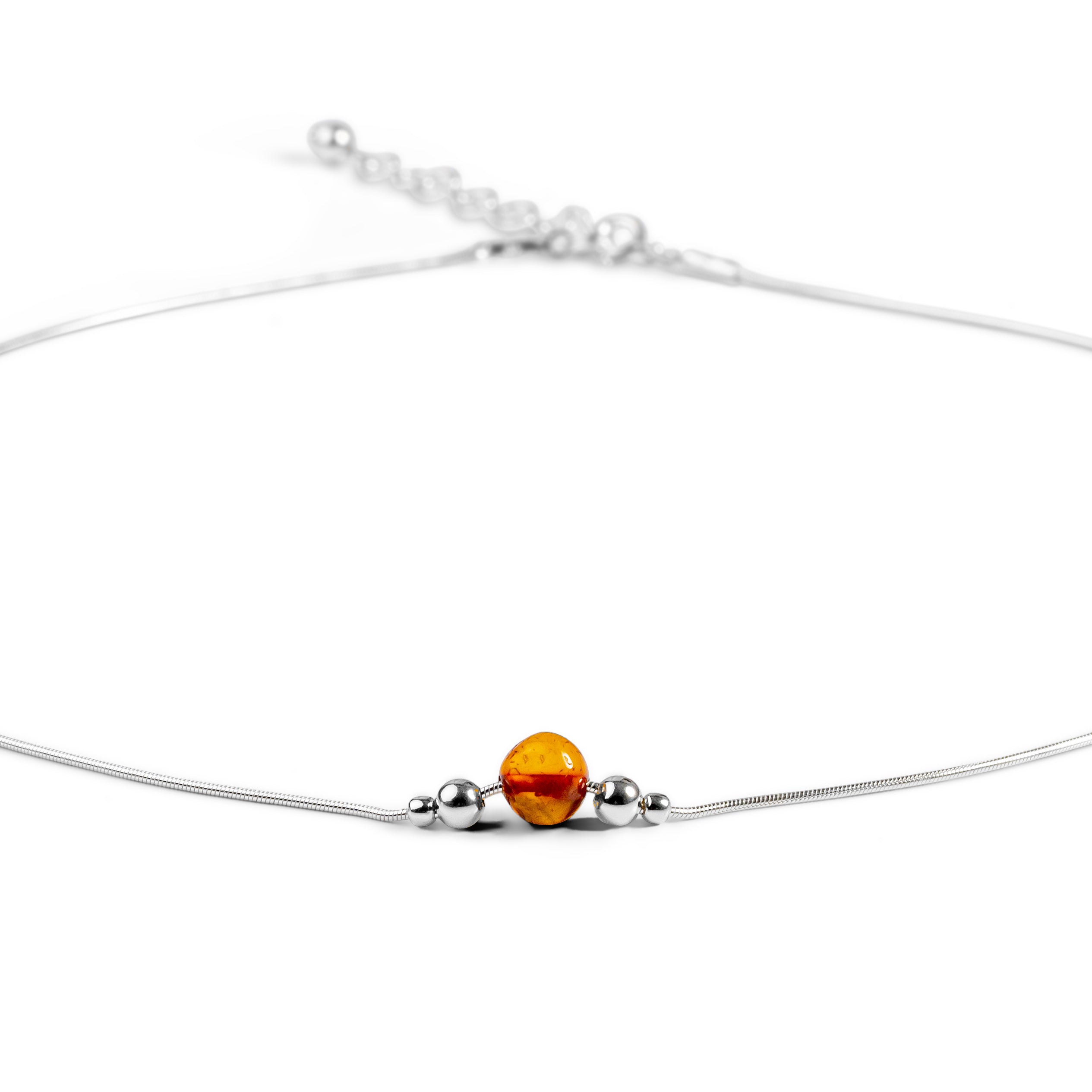 Crafted in 925 silver and adorned with a single round genuine Baltic Amber gemstone which is set between 2 smaller sphere shaped silver balls on each side. Finished on a solid silver snake style chain.