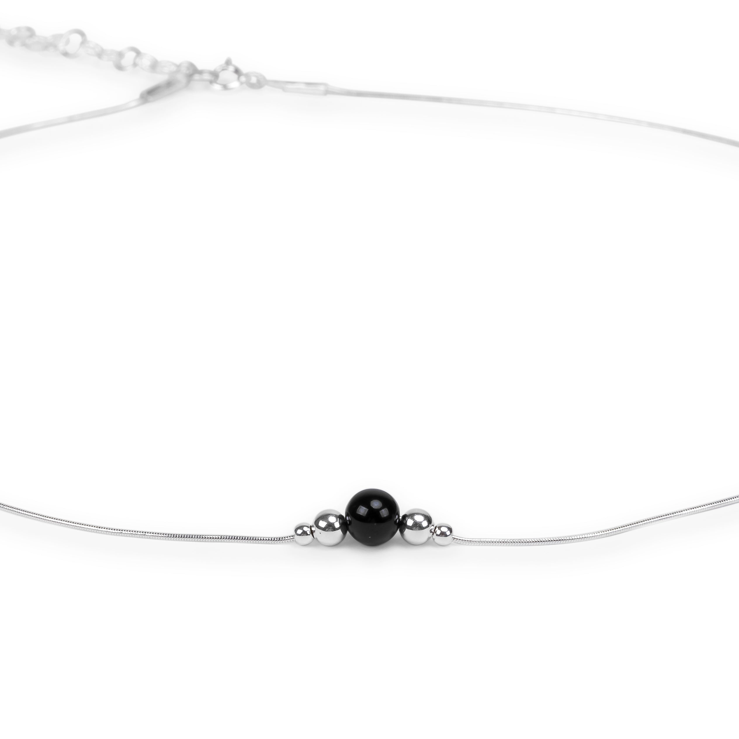 Crafted in 925 silver and adorned with a single round natural Black Onyx gemstone which is set between 2 smaller sphere shaped silver balls on each side. Finished on a solid silver snake style chain.