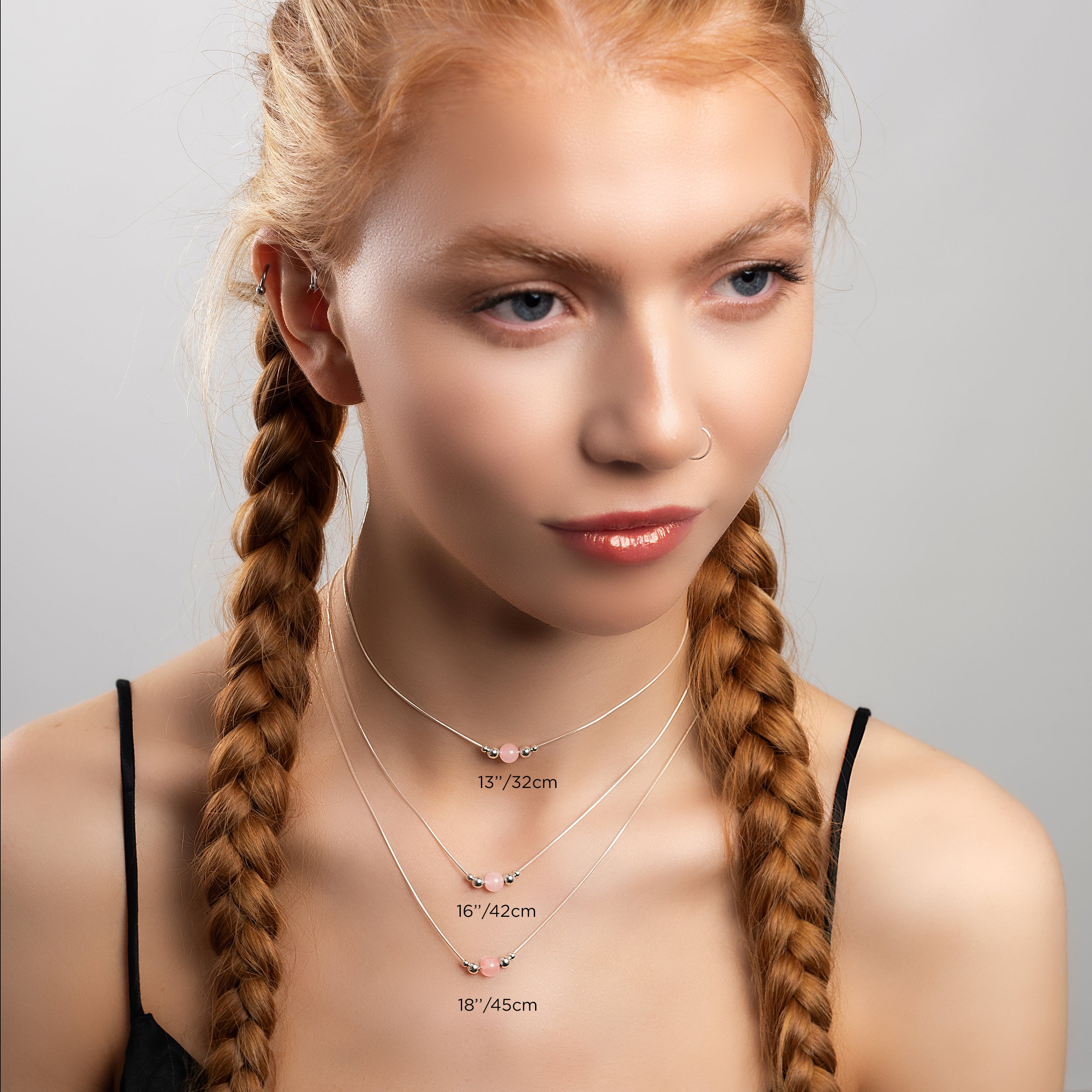 Crafted in 925 silver and adorned with a single round natural Rose Quartz gemstone which is set between 2 smaller sphere shaped silver balls on each side. Finished on a solid silver snake style chain.