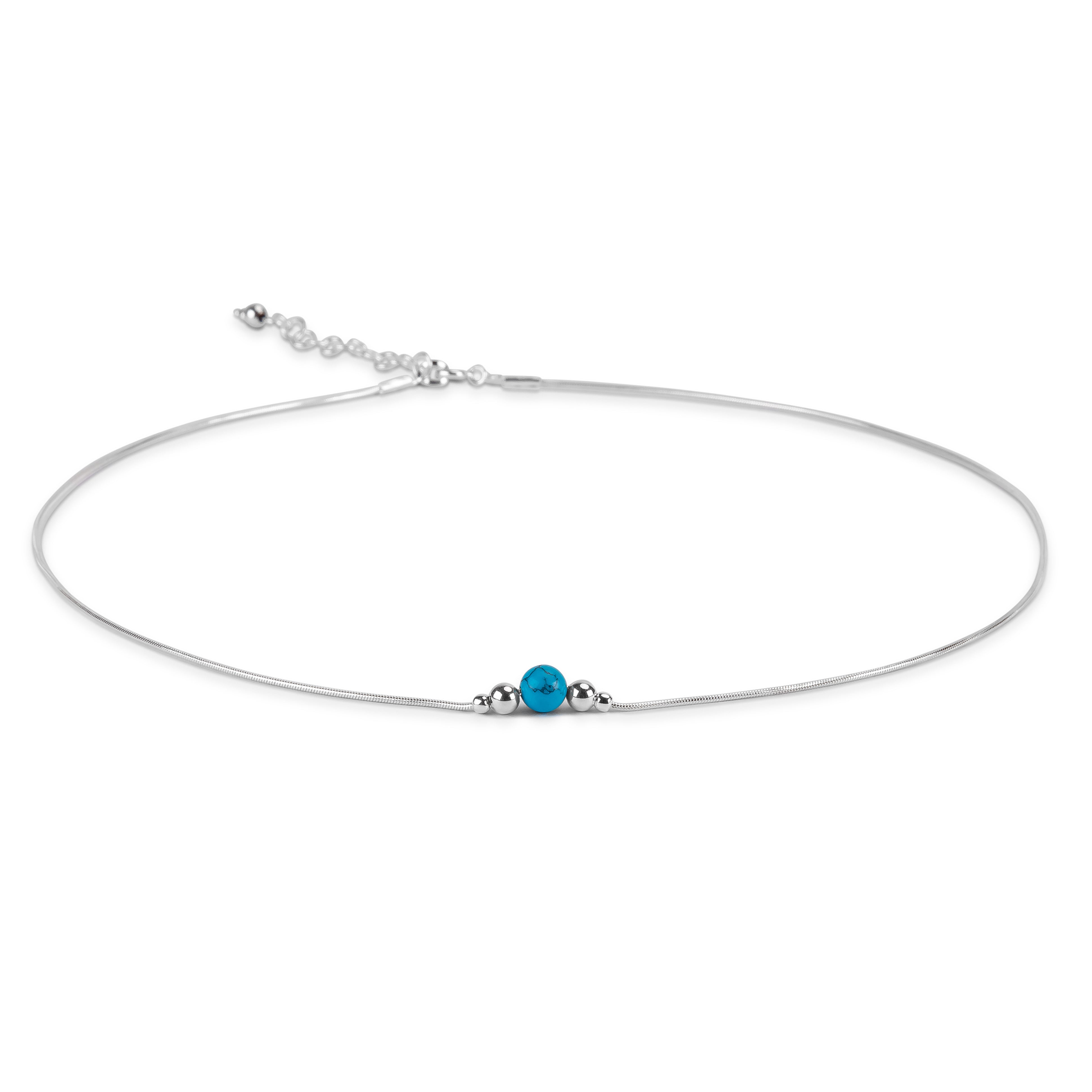 Crafted in 925 silver and adorned with a single round vibrant Turquoise stone which is set between 2 smaller sphere shaped silver balls on each side. Finished on a solid silver snake style chain.