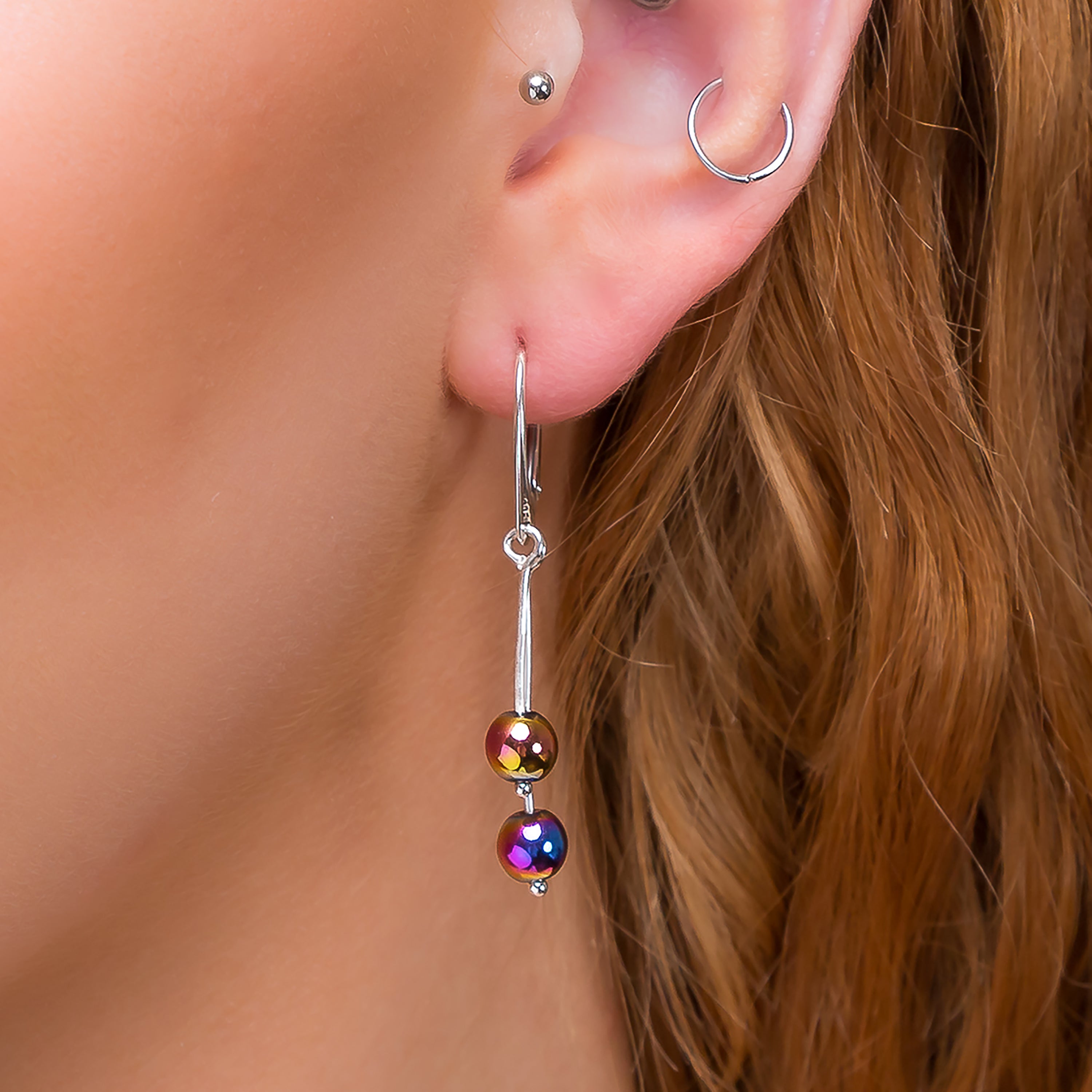 Crafted in 925 silver, each earring has a staggered two wire drop with a single sphere shaped Rainbow Titanium bead hanging. Finished with secure clip back hooks.