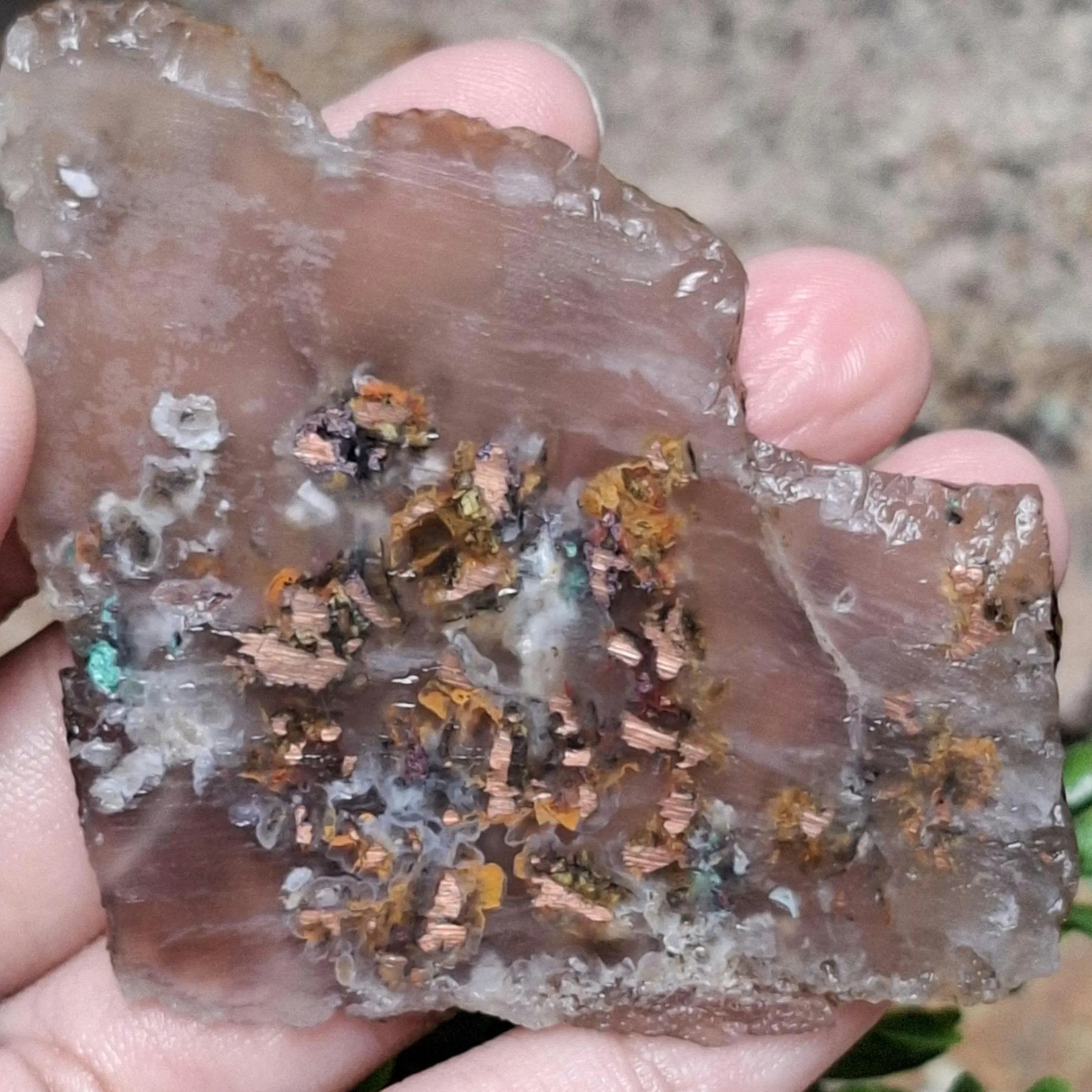 Copper Confetti" Inclusions: The stone is distinguished by its striking inclusions of copper and copper minerals such as red cuprite, blue chrysocolla, and green malachite. These inclusions are scattered throughout the chalcedony matrix, resembling confetti thrown in celebration.