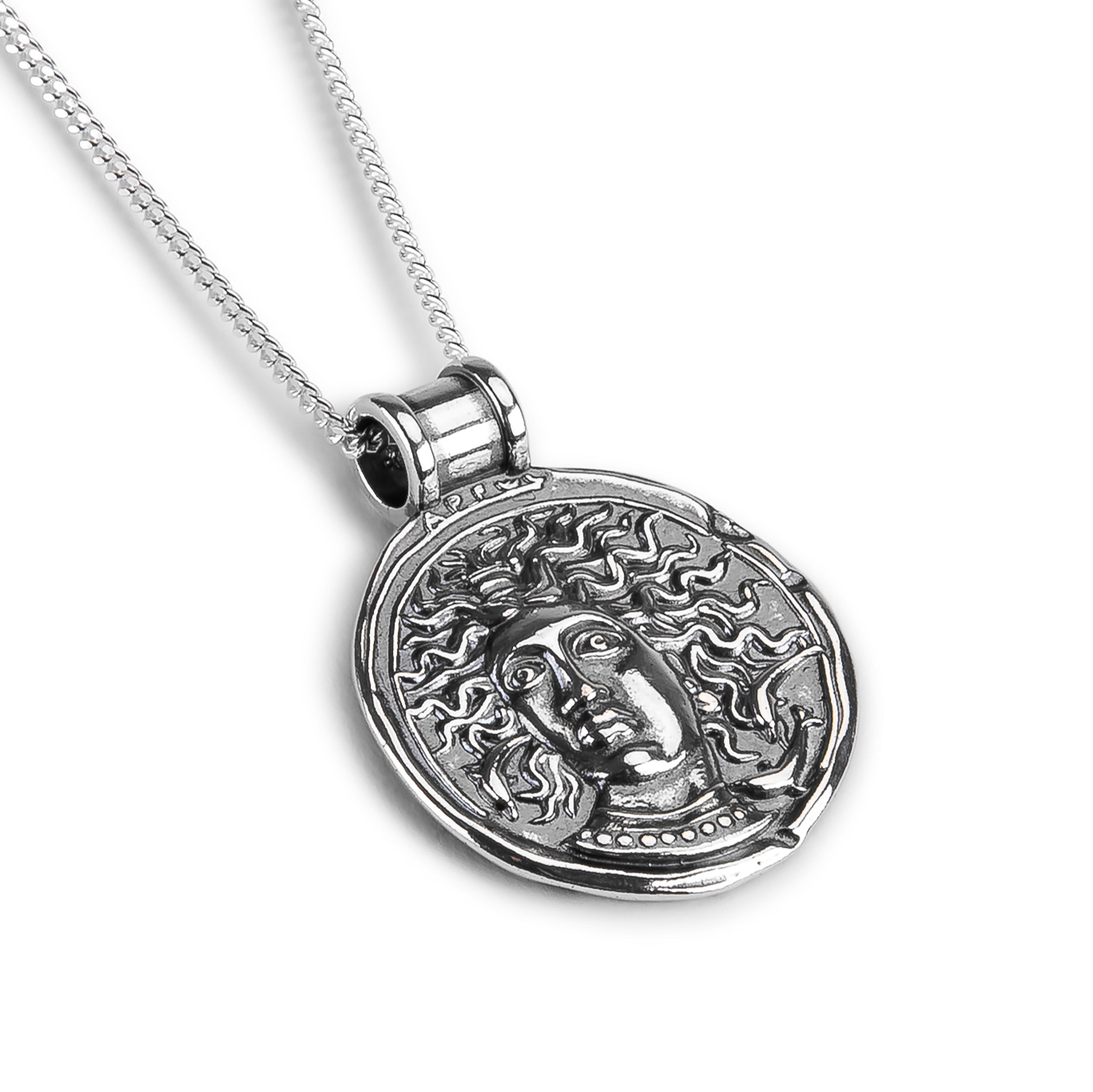 Lovingly crafted in 925 silver with 24ct Gold plating, this famous coin replica showcases one side that of the nymph Arethusa being captured. The reverse side shows a dynamic scene with a chariot. A classic example of this type of coin from 405-400BC.