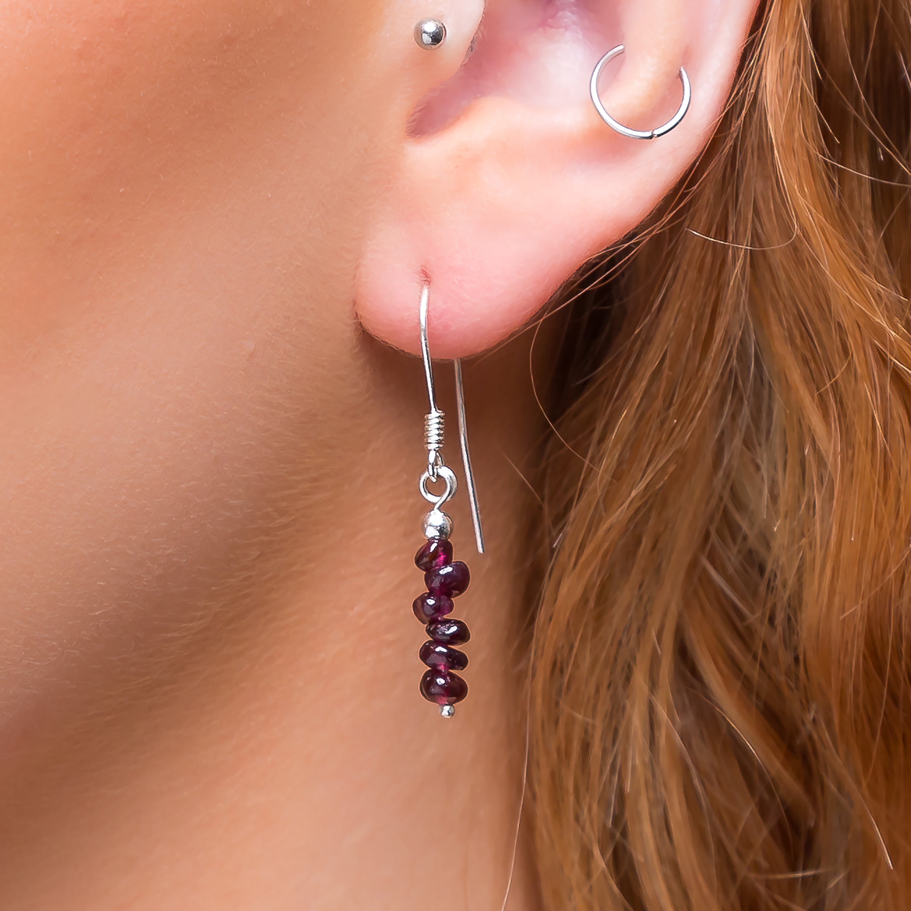 Brighten up your earwear! This mood-boosting piece is adorned with hand-picked and threaded natural red Garnet gemstones and features a sterling silver Shepard hooks.