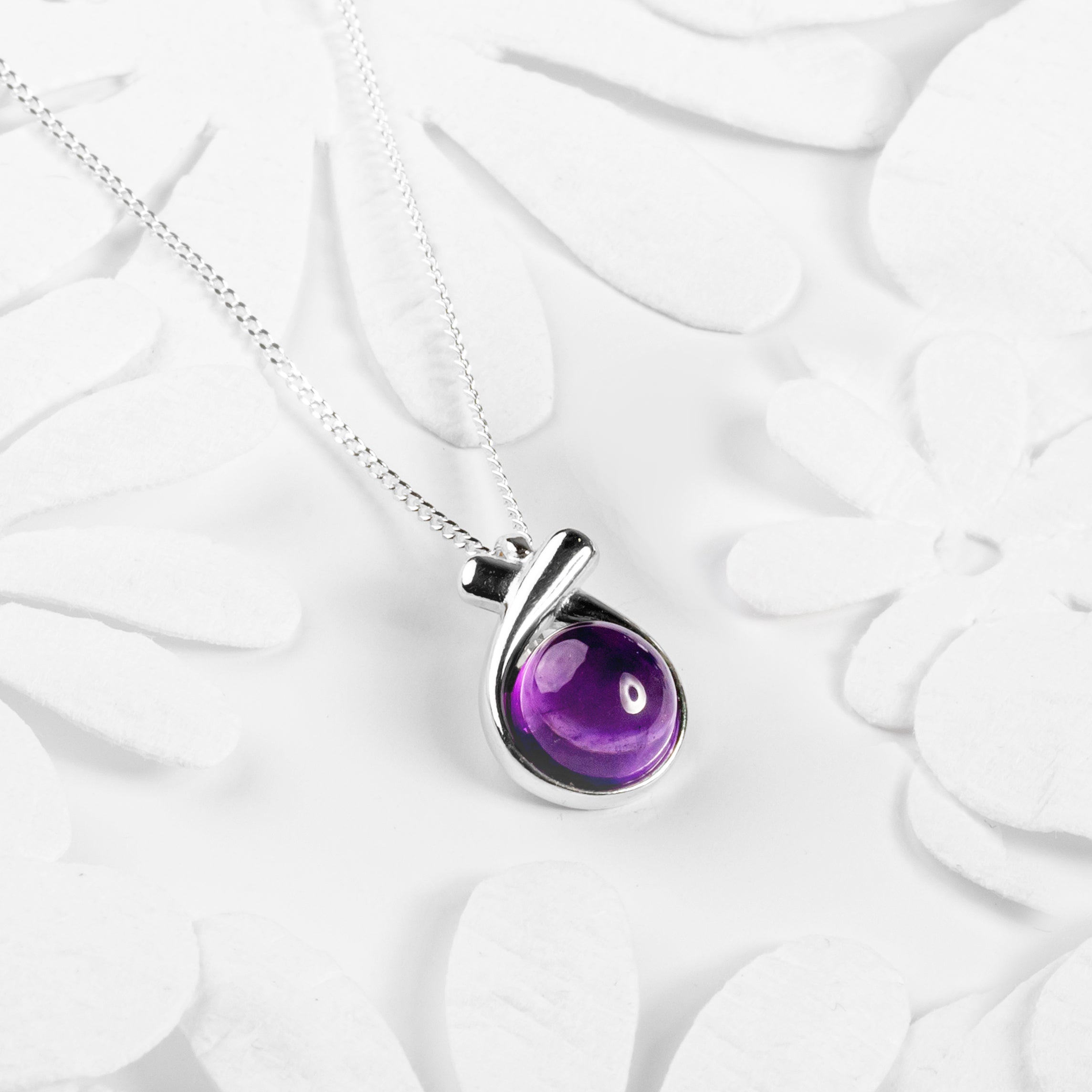 Crafted in 925 Sterling Silver with a notable 'kiss' shape which is holding a striking Amethyst gemstone at the centre. Complete with a solid silver chain , this necklace is simple in design, but a powerful symbol of affection and friendship.