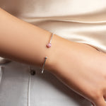 Handcrafted in 925 Sterling Silver, this solid cuff bangle is adorned with a single round Pink Opal gemstone at one end and a fixed silver ball at the other. With an easy open slip on style which can be adjusted to fit, it is comfortable and secure to wear. Cleverly handmade, this bangle will always look pristine and keep its shape