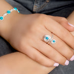 A silver ring with a large and small spiral detail holding two pieces of reconstituted turquoise. Wear as a thumb ring for a casual style.