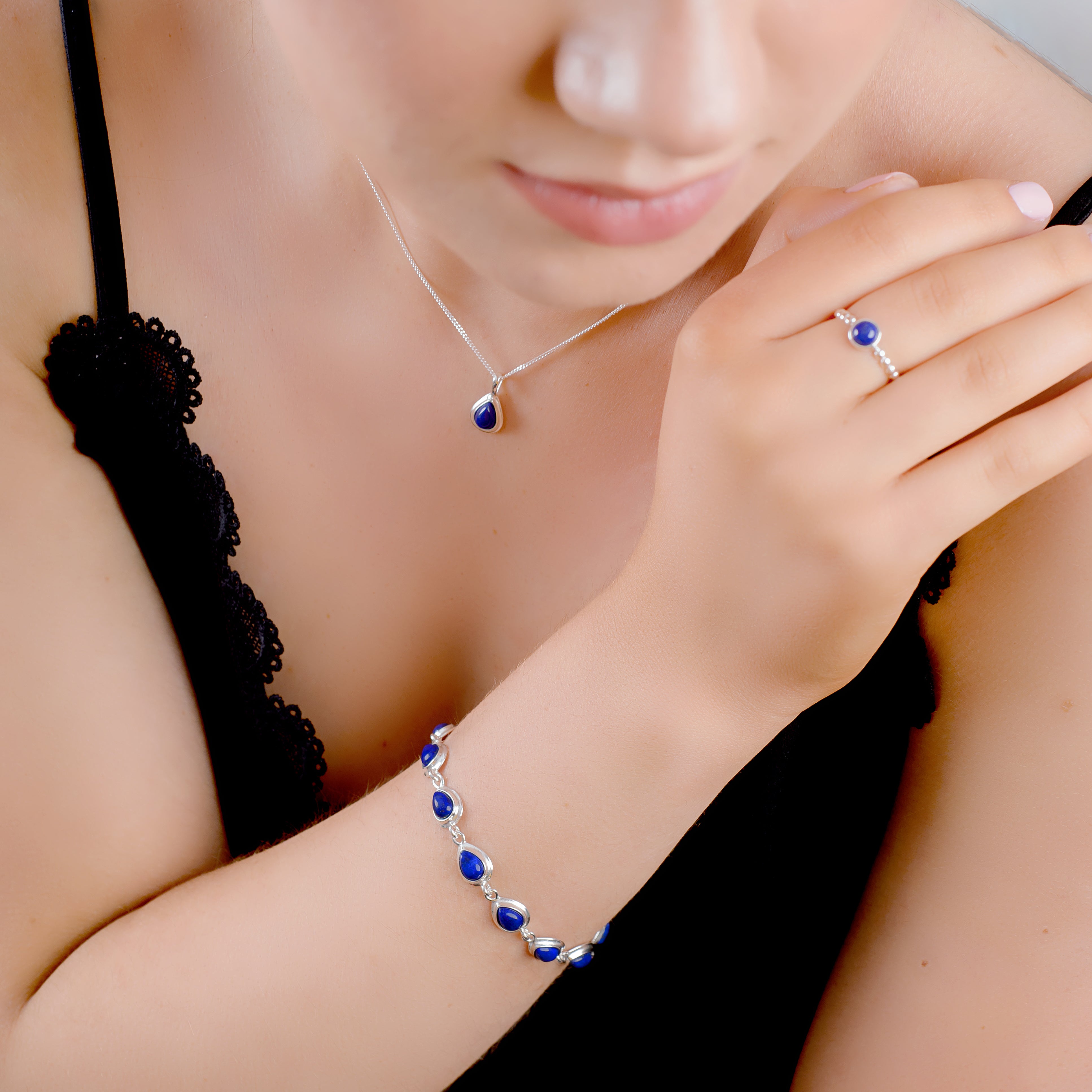 Handcrafted in solid 925 silver, this bracelet is adorned with 11 bold blue Lapis Lazuli gemstones which have been carefully cut and polished into a teardrop shape. Each stone is set and linked together in silver.