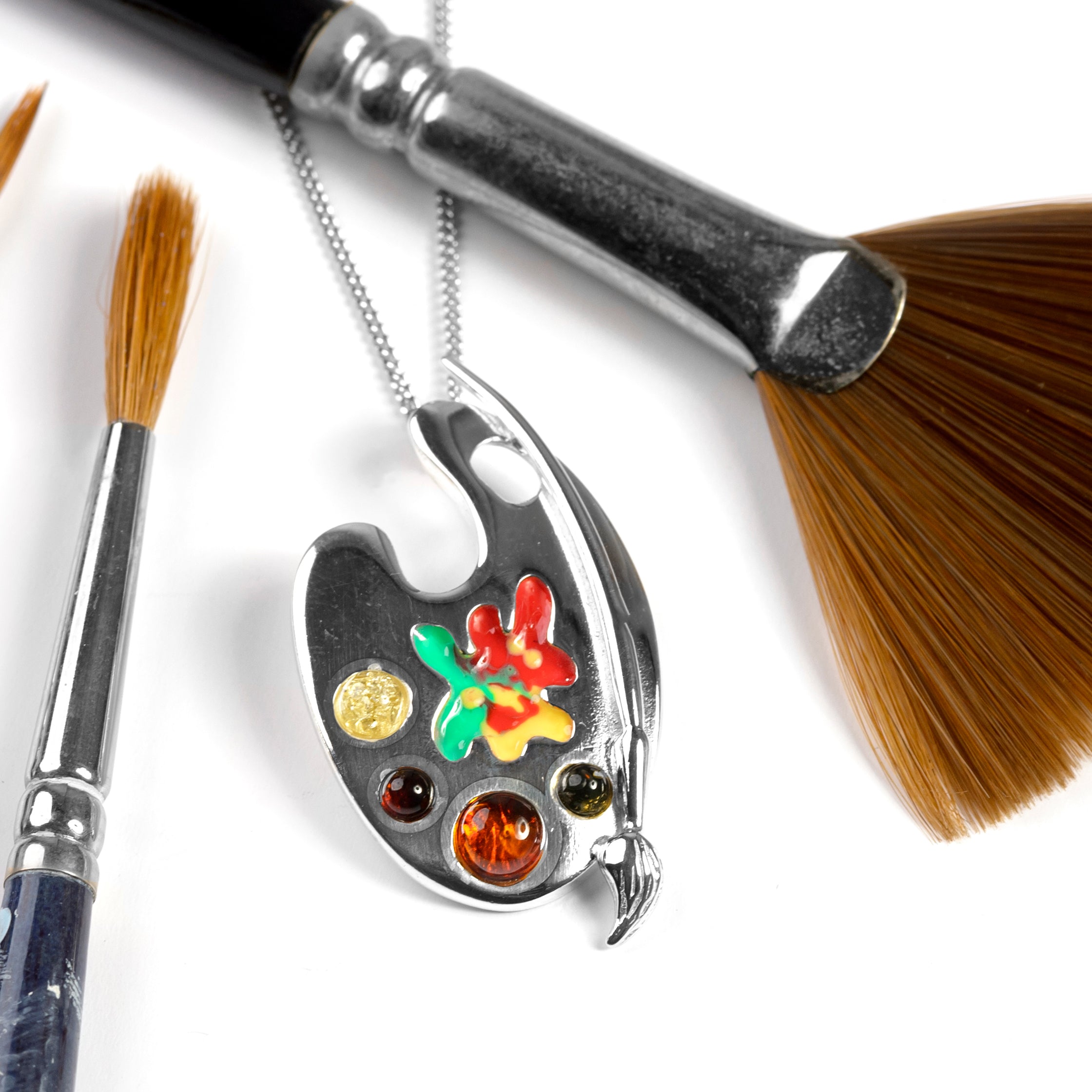 Crafted in 925 silver with carefully hand painted enamel paintwork and adorned with 4 individual genuine Baltic Amber gemstones and silver paintbrush on the side. Complete with a solid silver chain for secure wearing all day, everyday.