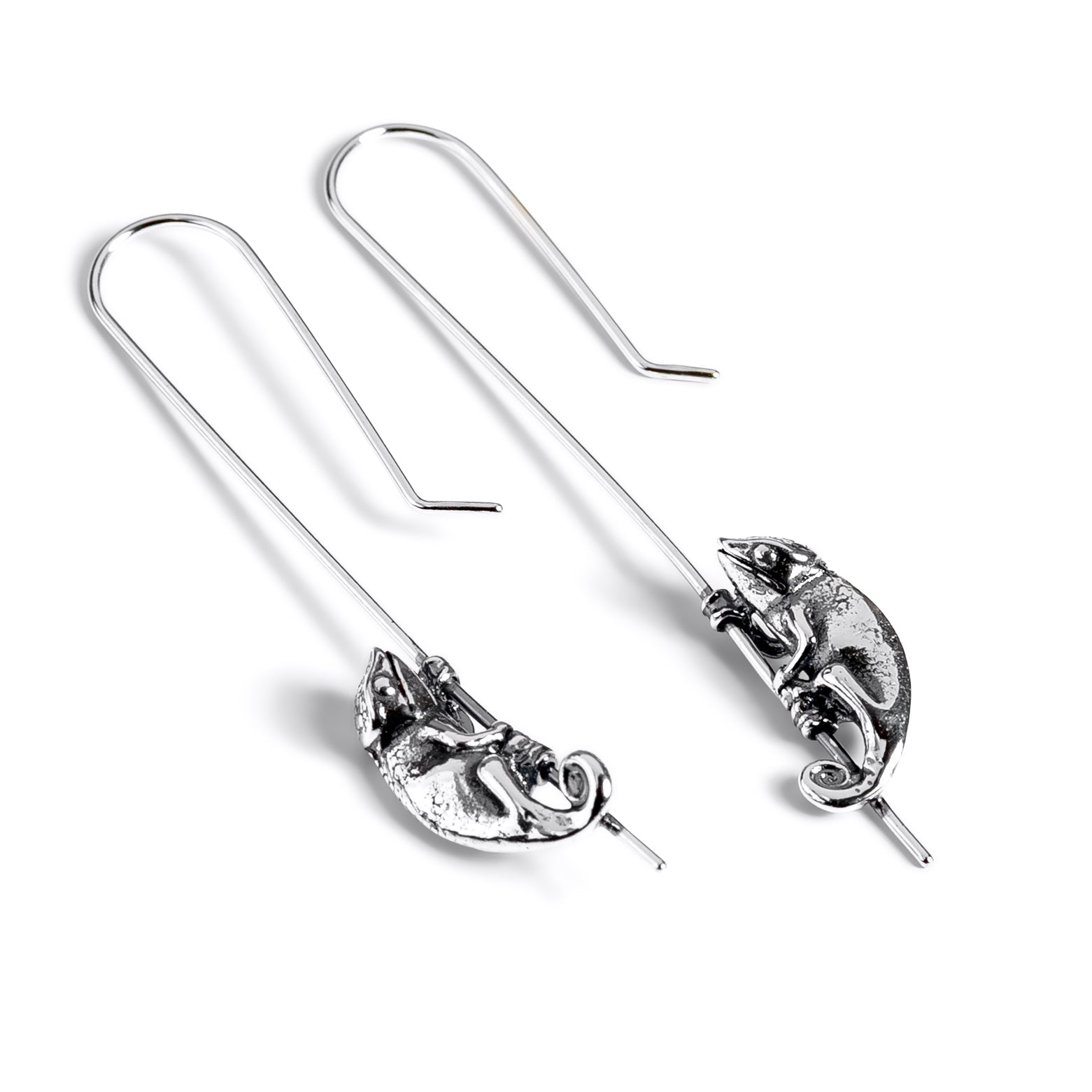 Handmade in 925 sterling silver with 24ct gold plating, each earring has a long solid silver stem with a carefully designed 3D Chameleon which appears to be climbing up the towards the ear. Finished with a shepherds hook fitting for secure and comfortable wearing.