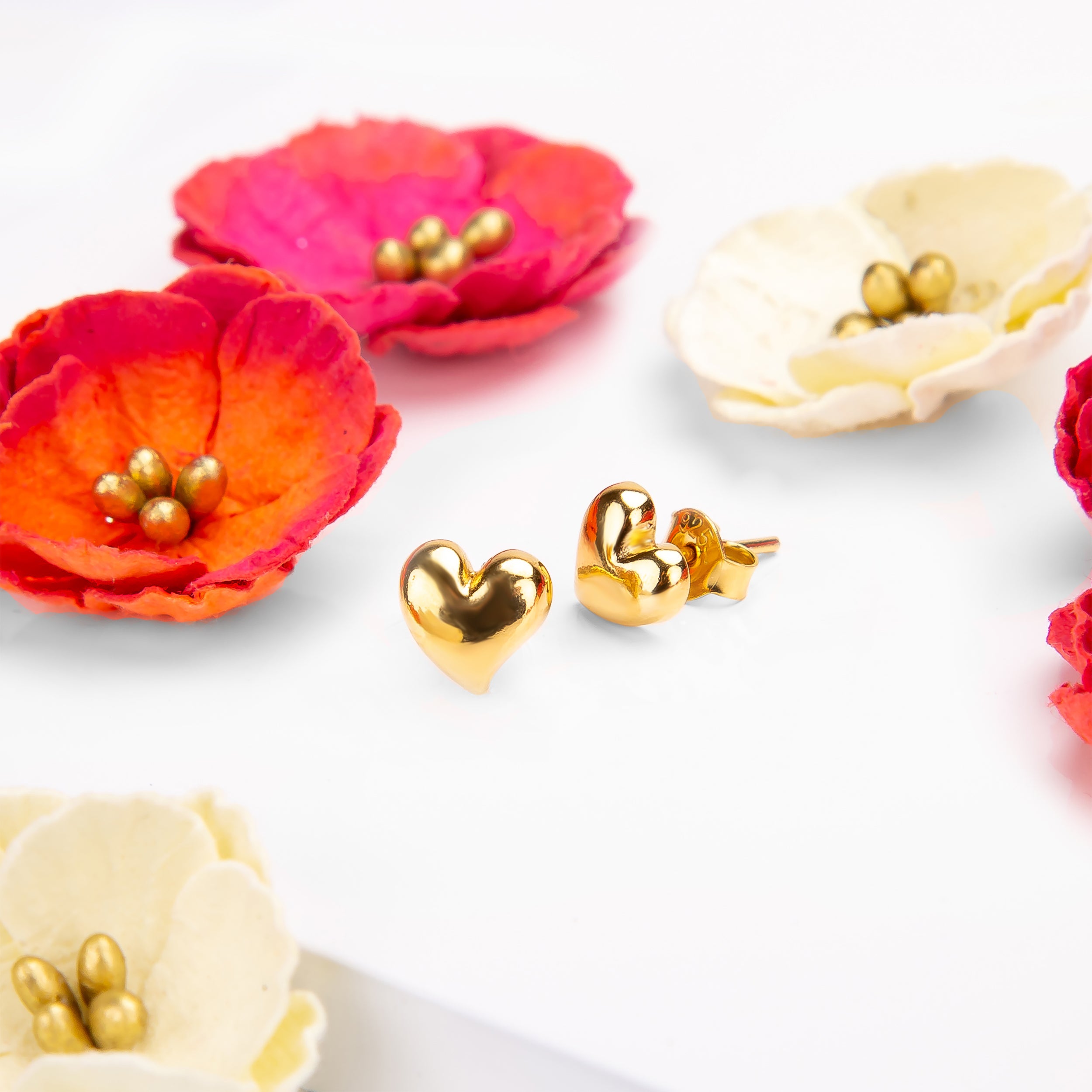 Handcrafted in 925 silver which have been gold plated, these delicate earrings have carefully shaped into a beautiful an asymmetrical heart shape. Finished in highly polished silver.