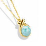 Crafted in 925 Sterling Silver finished 24ct Gold with a notable 'kiss' shape which is holding a sublime Larimar gemstone at the centre. Complete with a solid silver chain , this necklace is simple in design, but a powerful symbol of affection and friendship.