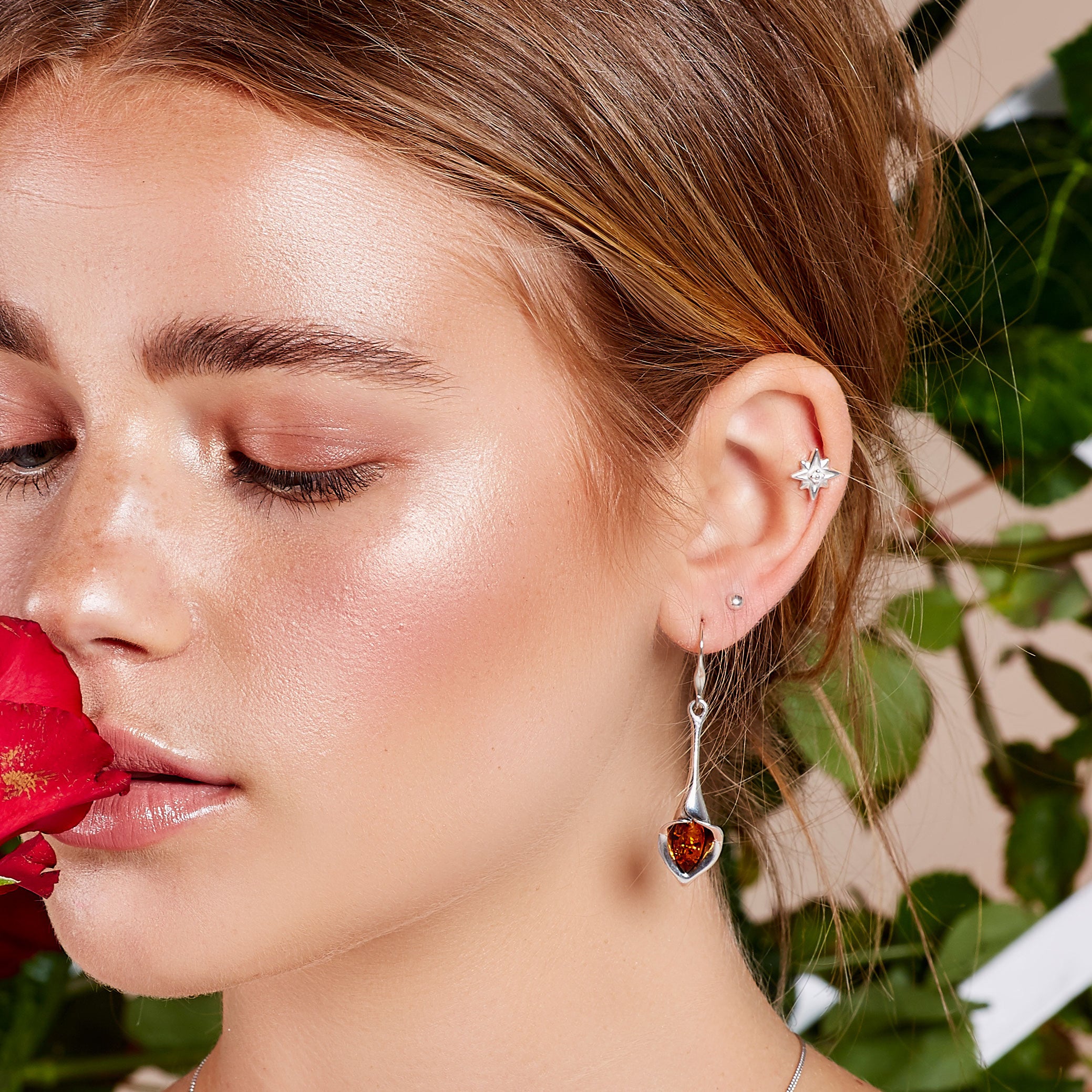 Lily Flower Drop Earrings in Silver and Amber