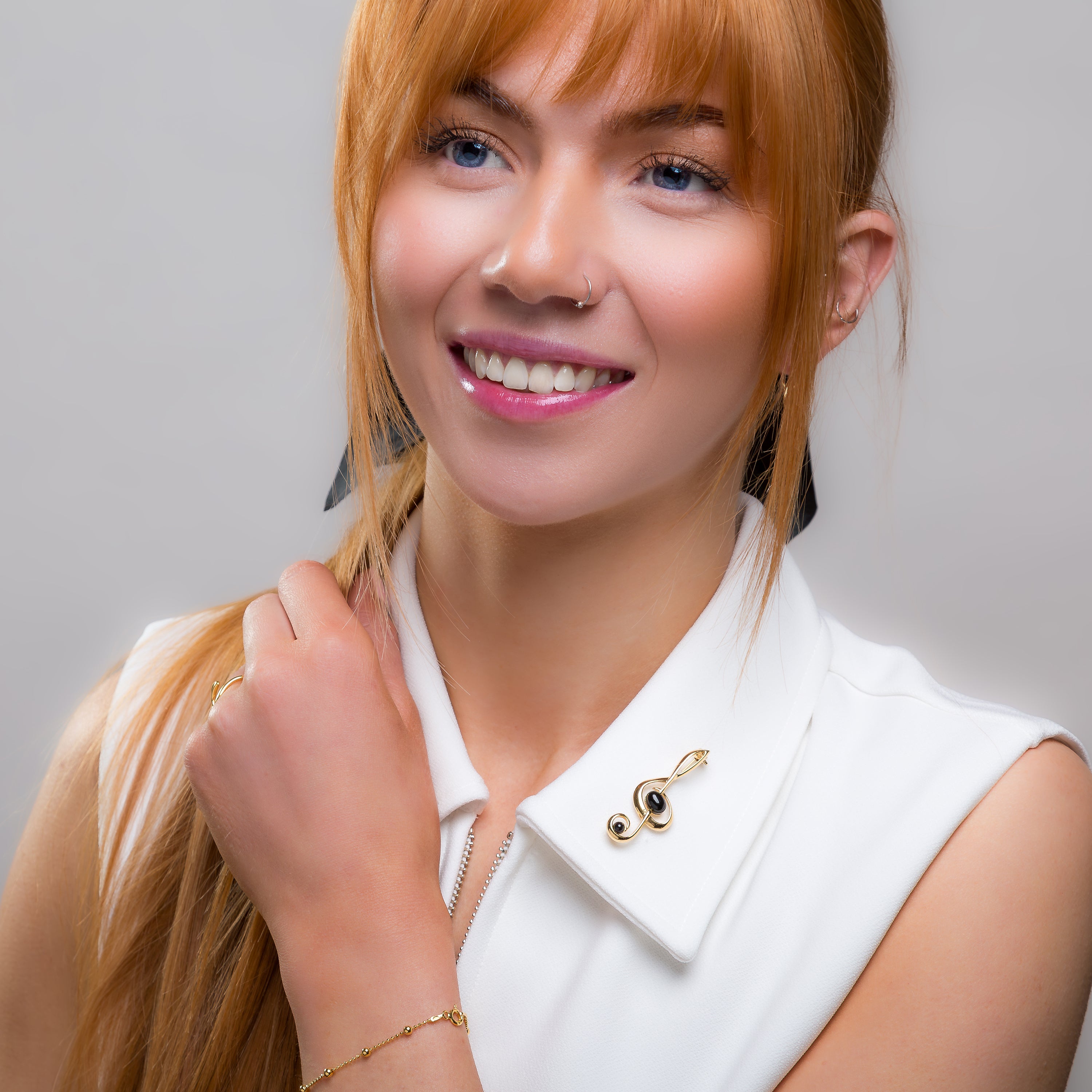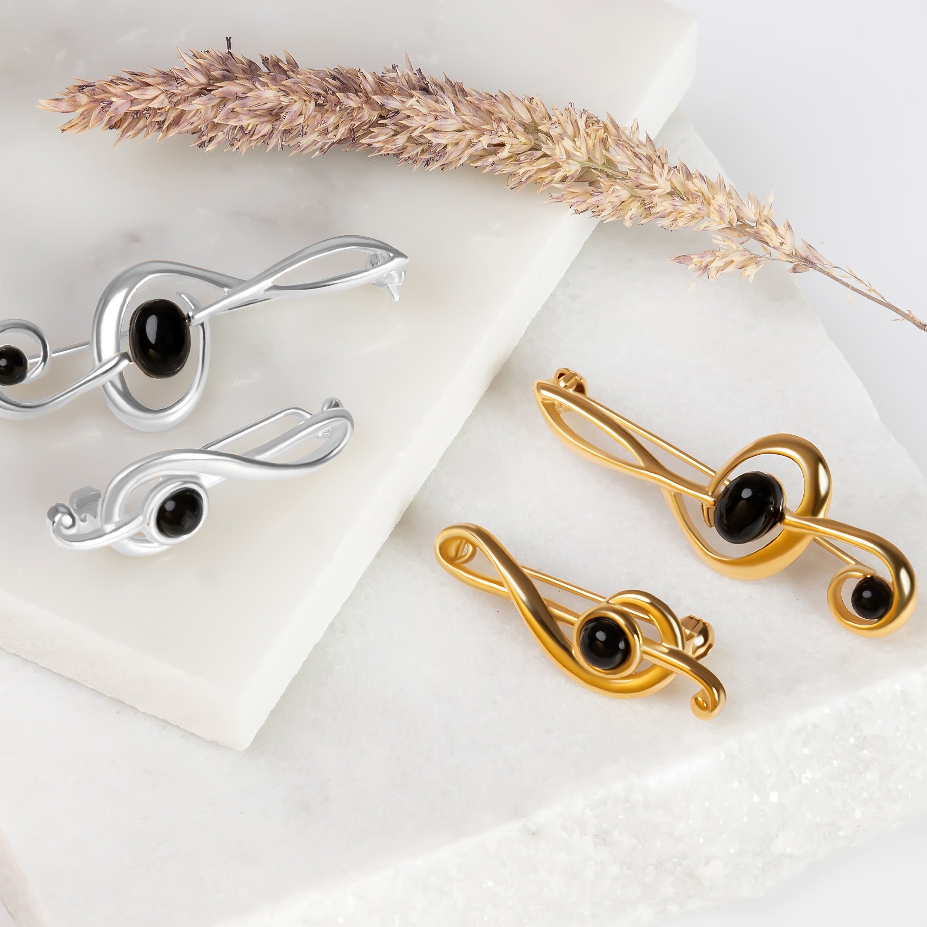 Handcrafted in 925 silver and finished in 24ct Gold to form a traditional Treble Clef and adorned with natural Black Onyx gemstone at the centre and bottom of the clef. Complete with a solid pin and safety clasp fitting.