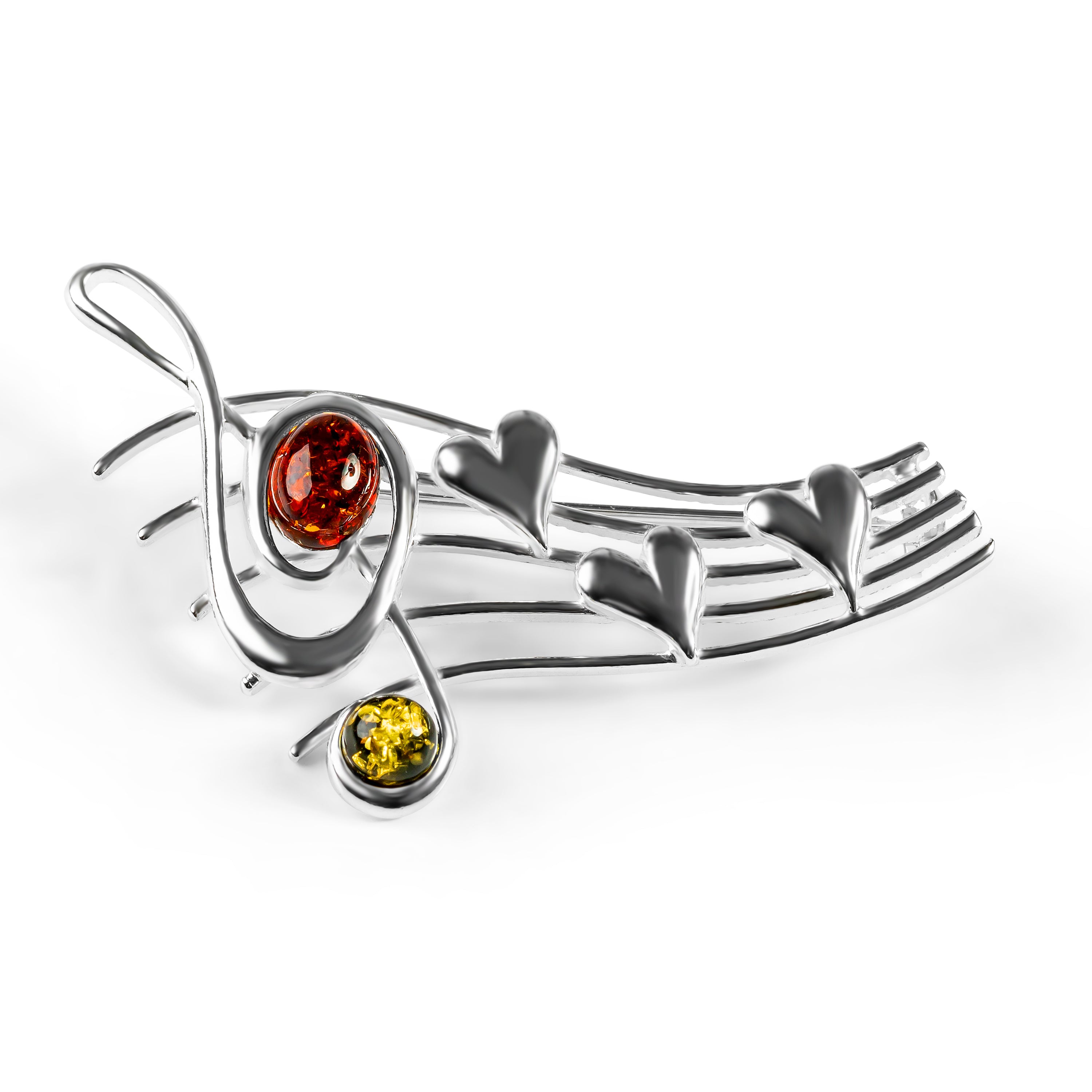 Handcrafted in 925 silver to form a traditional music sheet with a large Treble Clef adorned with genuine Green Amber and Cognac Amber gemstones to give them a lovely pop of colour. Finished with pretty solid silver heart to represent the music notes along the song sheet. Complete with a solid silver pin and safety clasp fitting.
