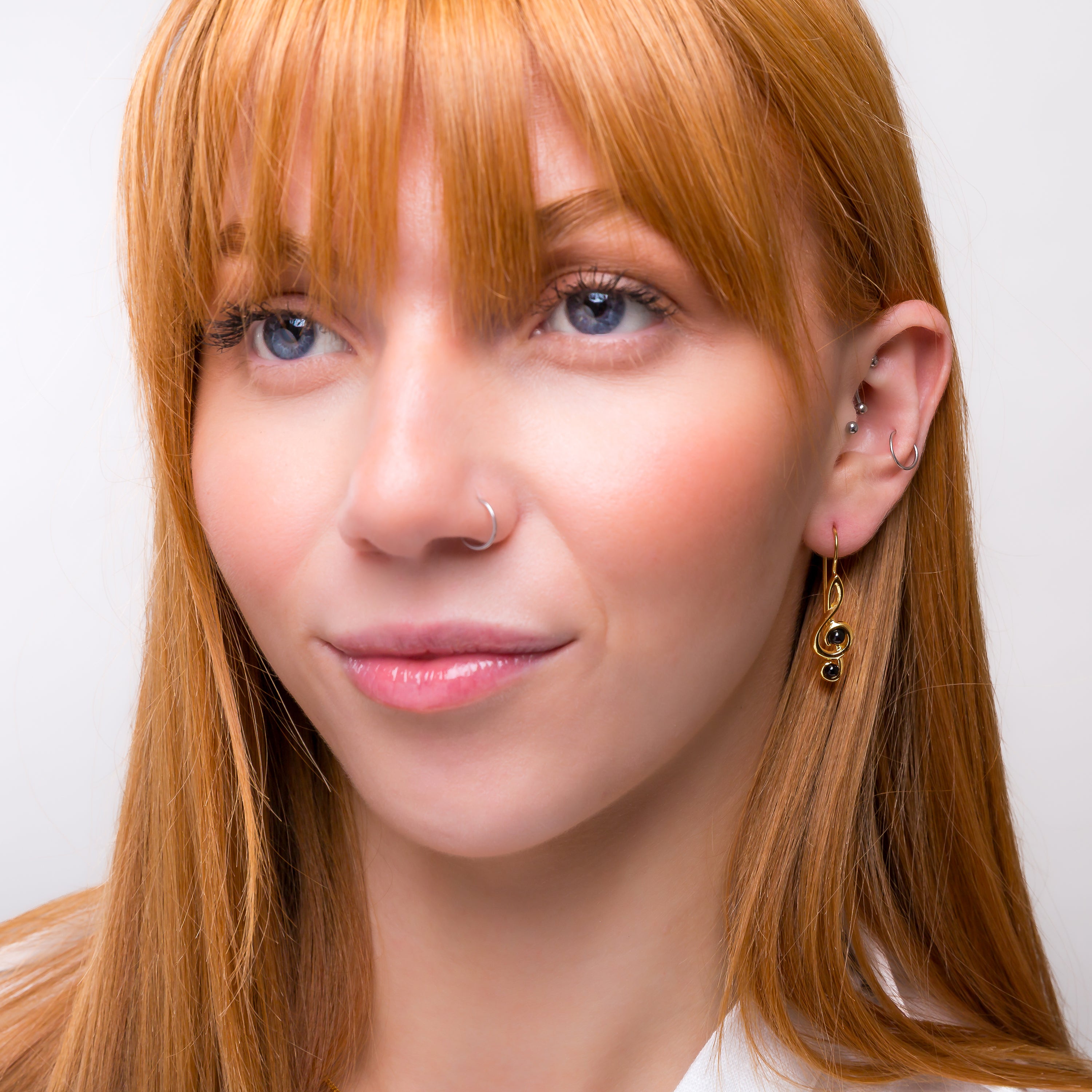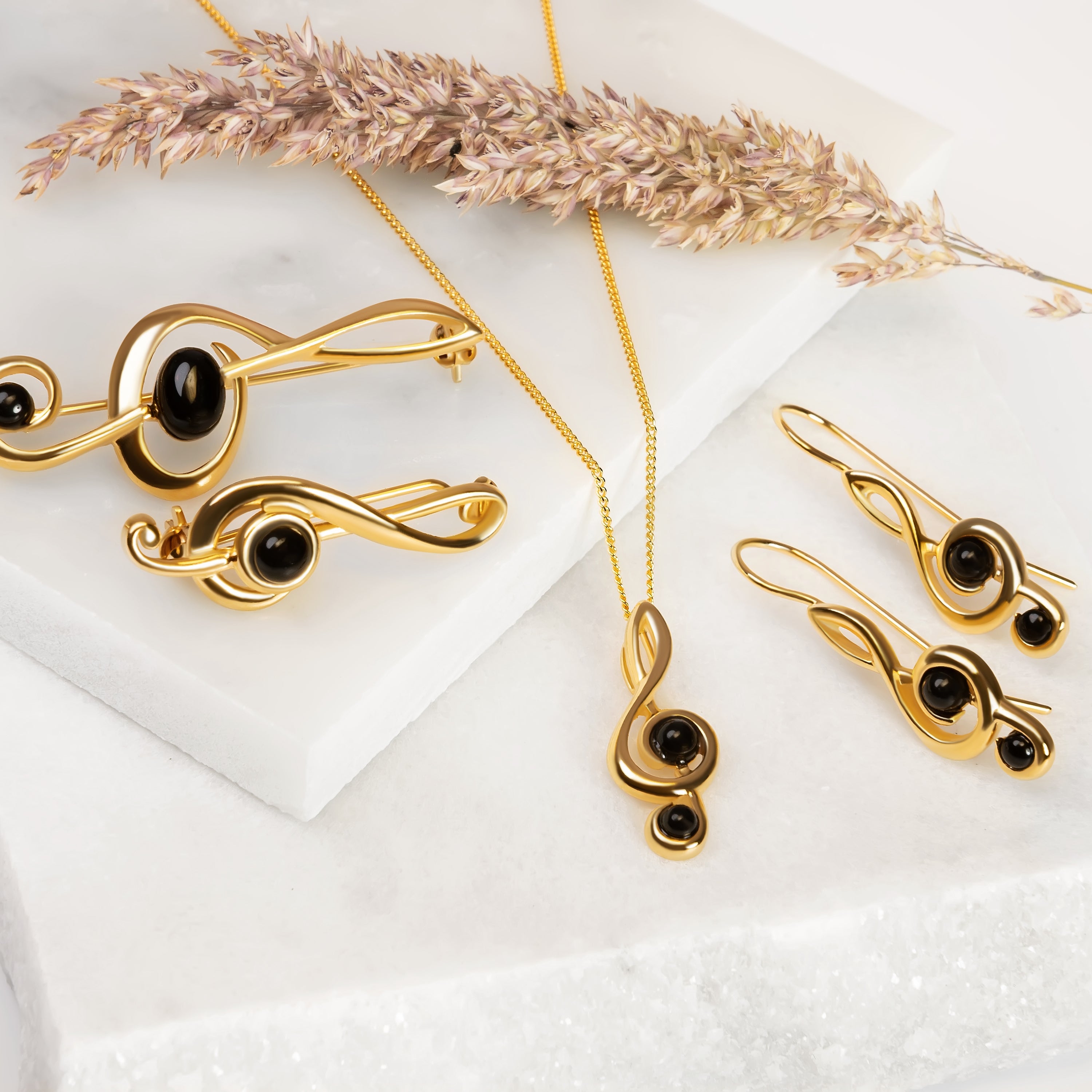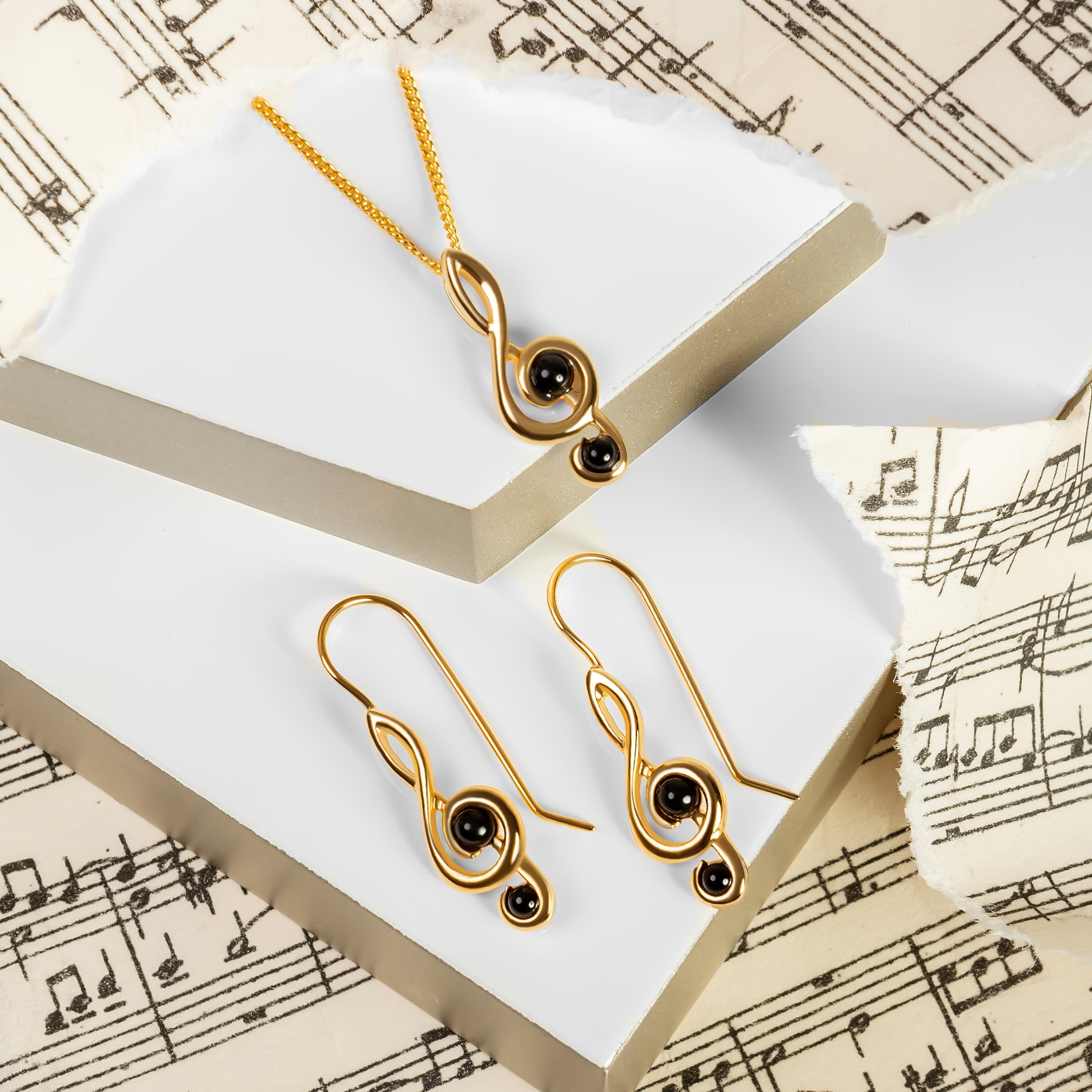 Handcrafted in 925 silver and finished in 24ct Gold plating, each earring is perfectly formed into the classic treble clef shape and adorned with natural Black Onyx gemstones to give them a lovely pop of colour. Complete with hook fittings so they will dangle from the ear beautifully.