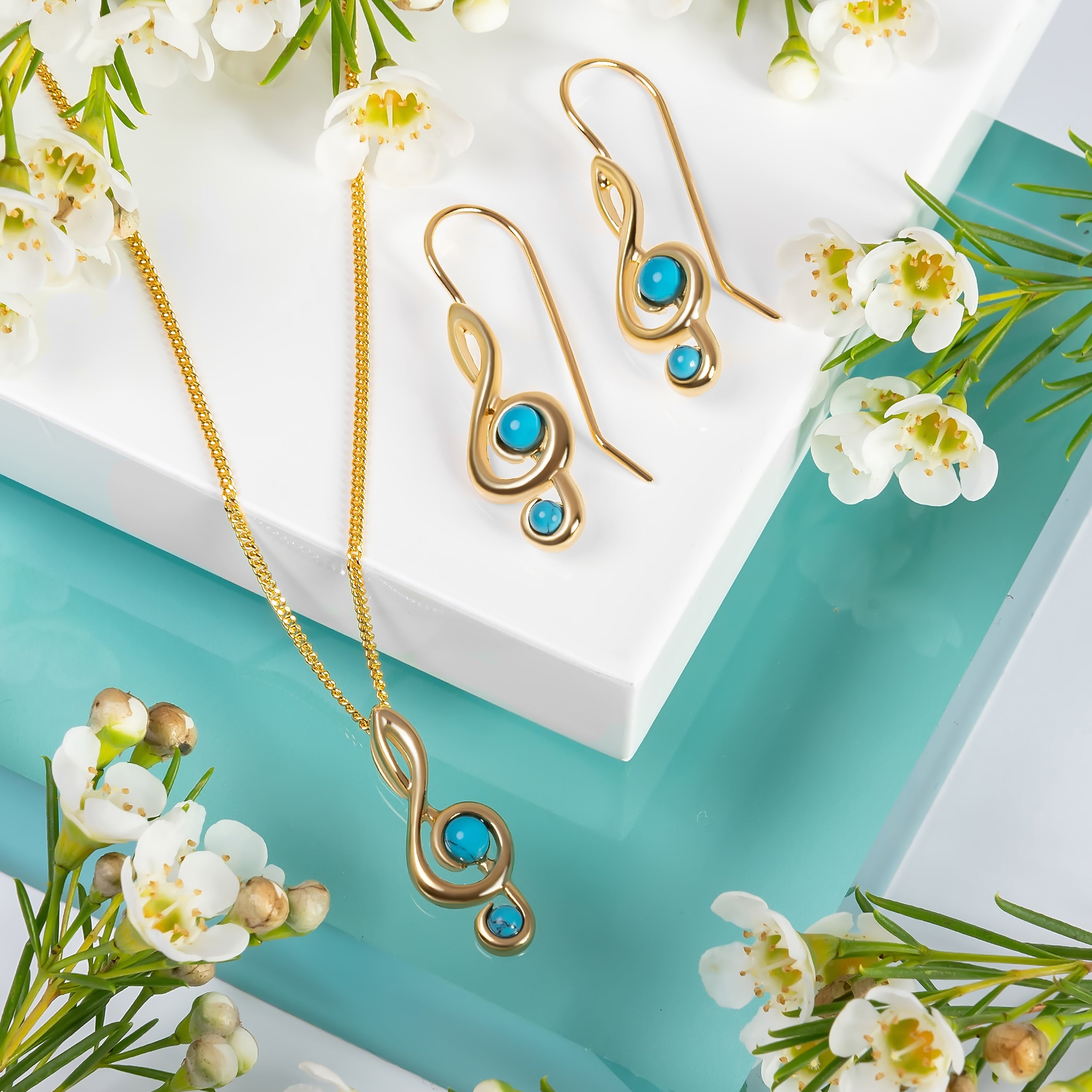 Handcrafted in 925 silver and finished in 24ct Gold plating, each earring is perfectly formed into the classic treble clef shape and adorned with vibrant Turquoise stones to give them a lovely pop of colour. Complete with hook fittings so they will dangle from the ear beautifully.