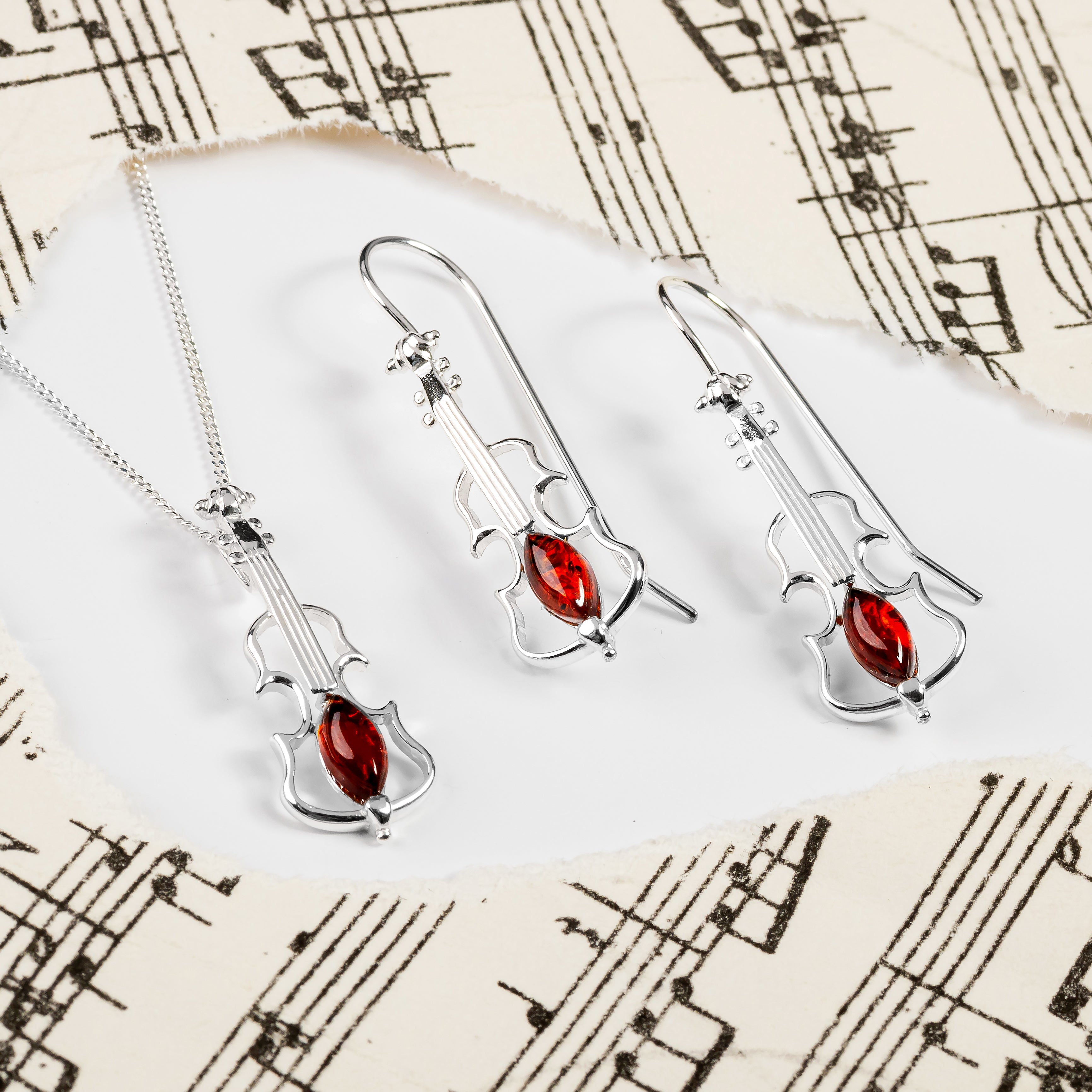 Crafted in Sterling Silver, each earring has been carefully designed into a perfect violin shape and adorned with a genuine Baltic Amber at the centre to add a pop of warm colouring. With intricate silver work to show all the famous attributes of this popular musical instrument. Finished with solid silver hooks for a secure and comfortable wearing.