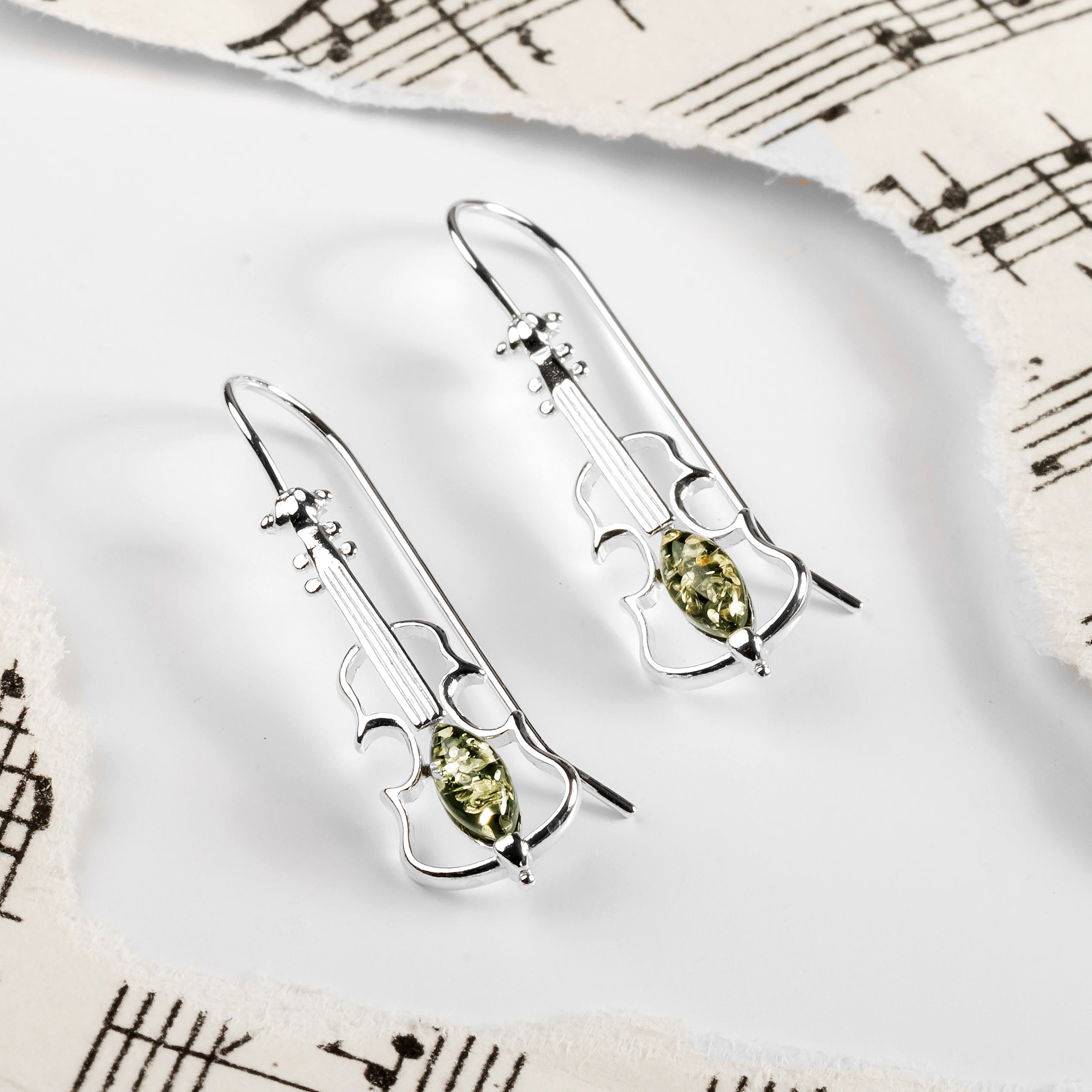 Crafted in Sterling Silver, each earring has been carefully designed into a perfect violin shape and adorned with a genuine Baltic Green Amber gemstone at the centre to add a pop of warm colouring. With intricate silver work to show all the famous attributes of this popular musical instrument. Finished with solid silver hooks for a secure and comfortable wearing.