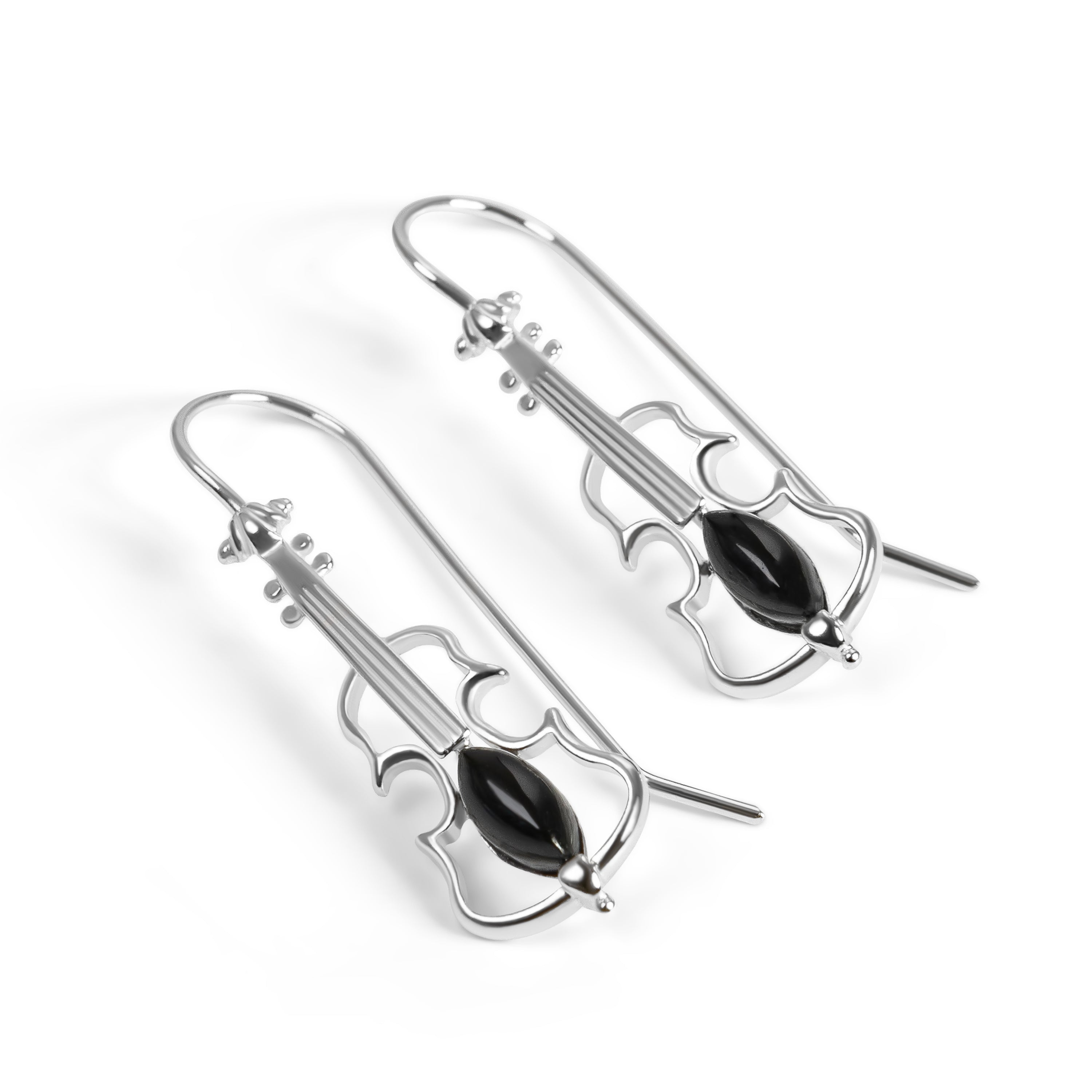 Crafted in Sterling Silver with 24ct Gold, each earring has been carefully designed into a perfect violin shape and adorned with a Black Onyx gemstone at the centre to add a pop of warm colouring. With intricate silver work to show all the famous attributes of this popular musical instrument. Finished with solid silver hooks for a secure and comfortable wearing.