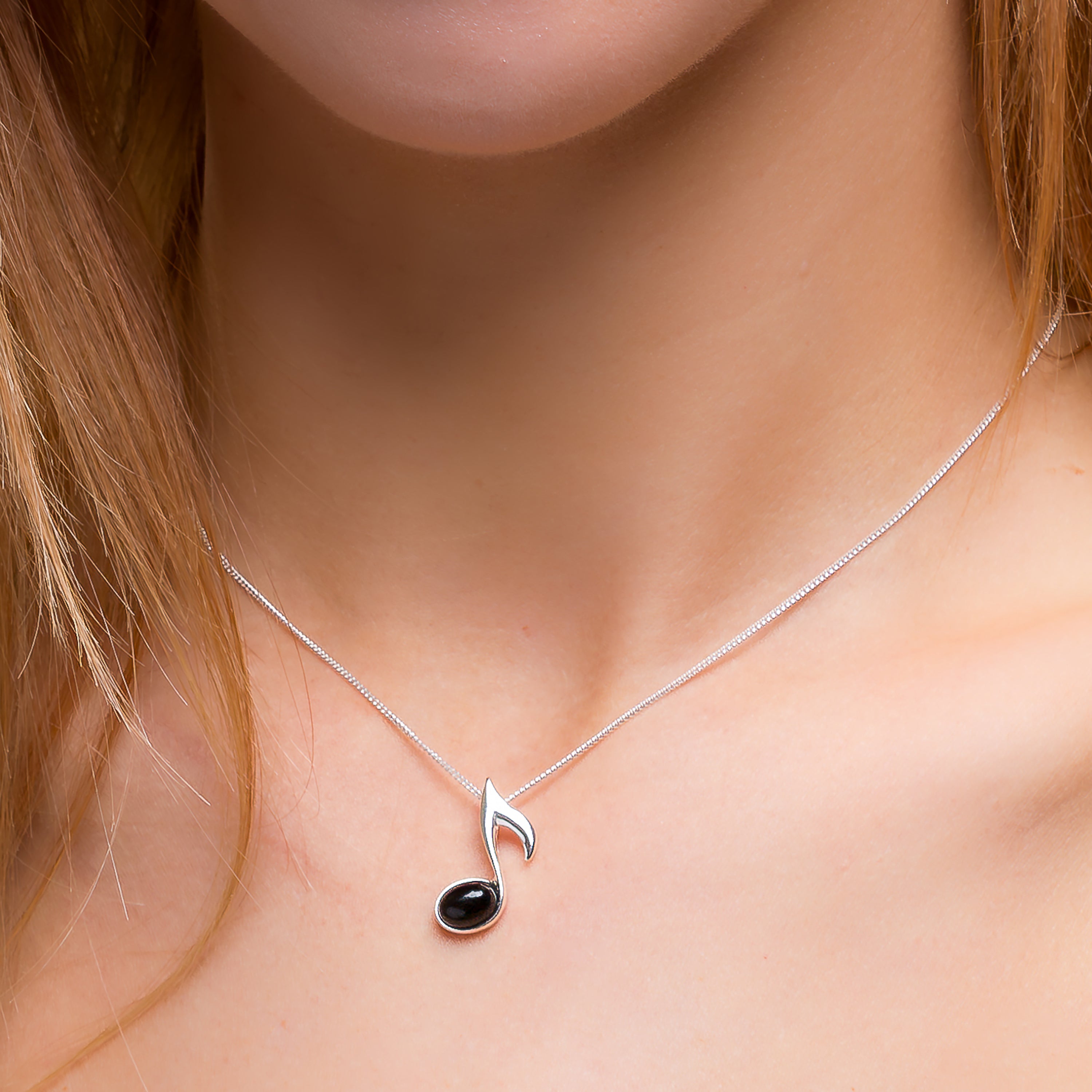 Handcrafted in 925 Sterling Silver, it is adorned with a single round Black Onyx gemstone in the note. It is finished with a carefully shaped stem to create the typical 'quaver' or 'eighth note' appearance. Complete with a silver chain, it will make a thoughtful gift for all ages.