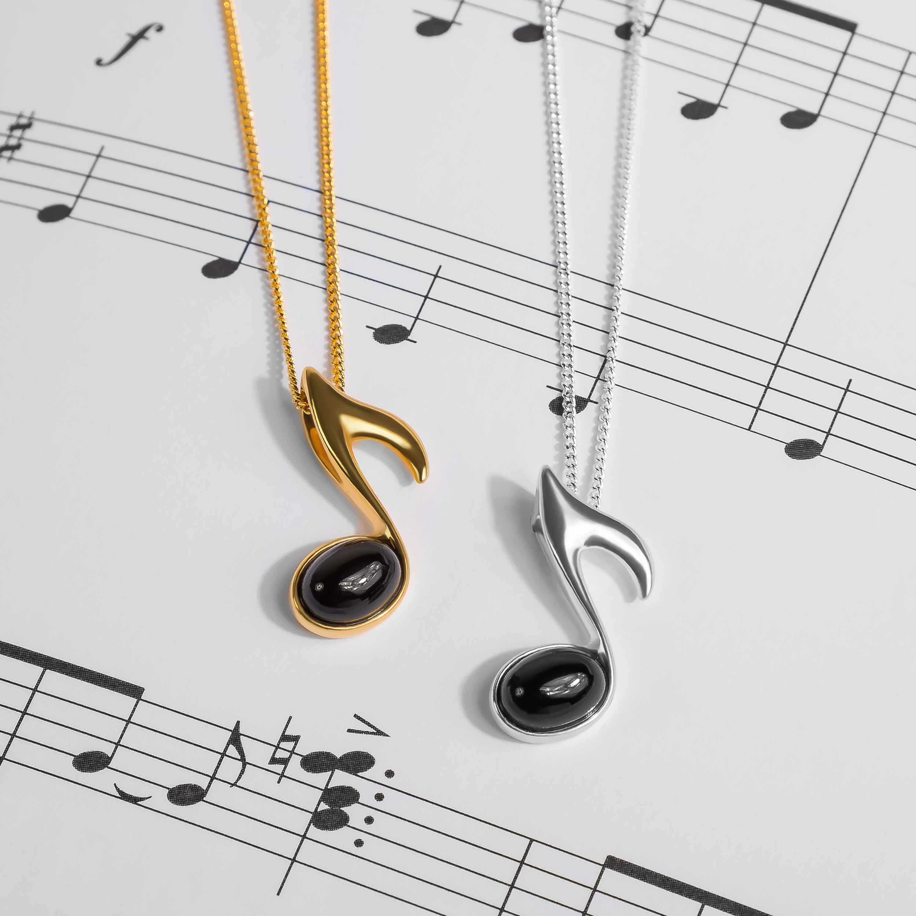 Handcrafted in 925 Sterling Silver in 24ct gold, it is adorned with a single round Black Onyx gemstone in the note. It is finished with a carefully shaped stem to create the typical 'quaver' or 'eighth note' appearance. Complete with a silver gold plated chain, it will make a thoughtful gift for all ages.