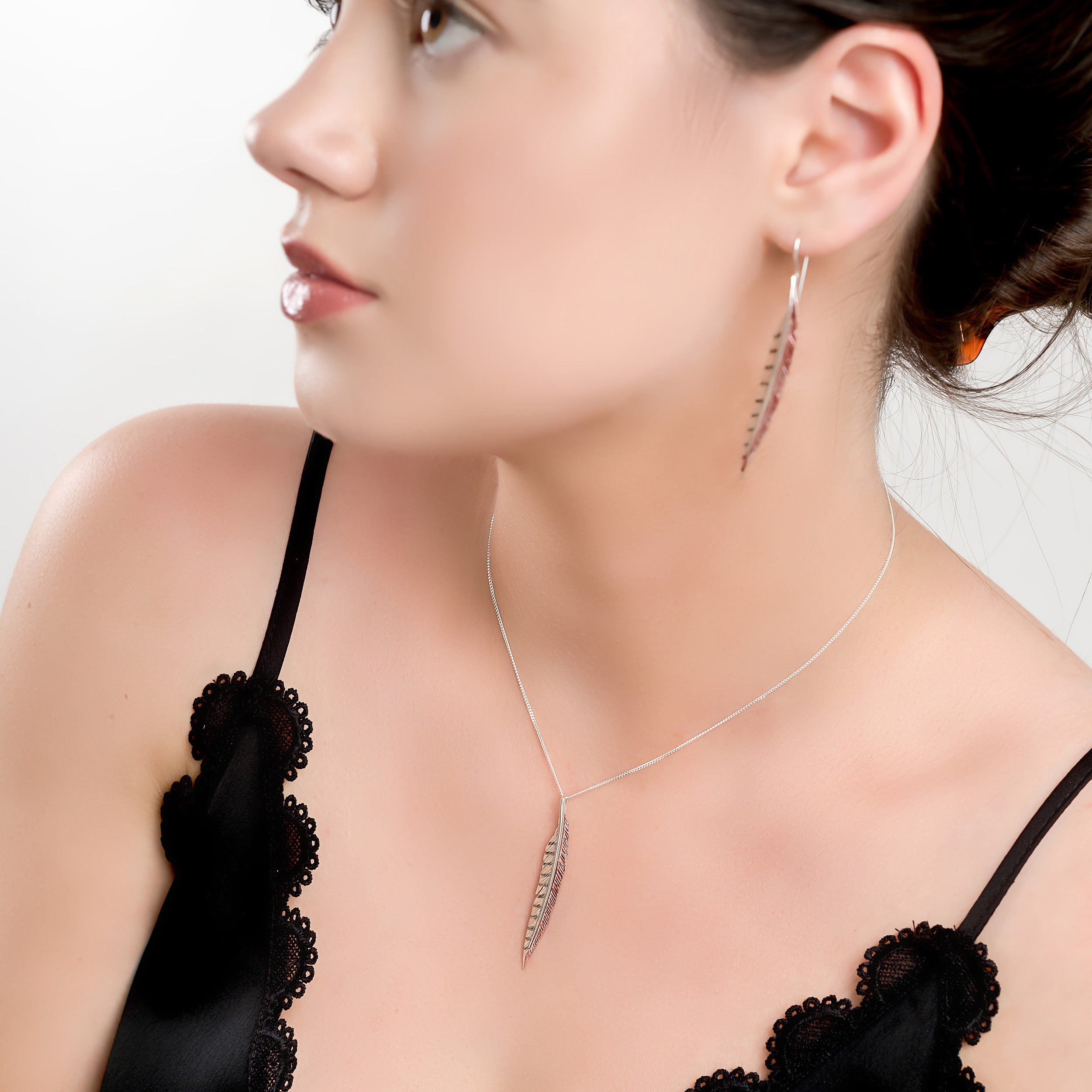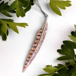 Crafted in 925 Sterling Silver and shaped into a long Pheasant Feather shape which has been painted to show the intricate markings that are famous to this bird. Complete with solid silver curb chain.