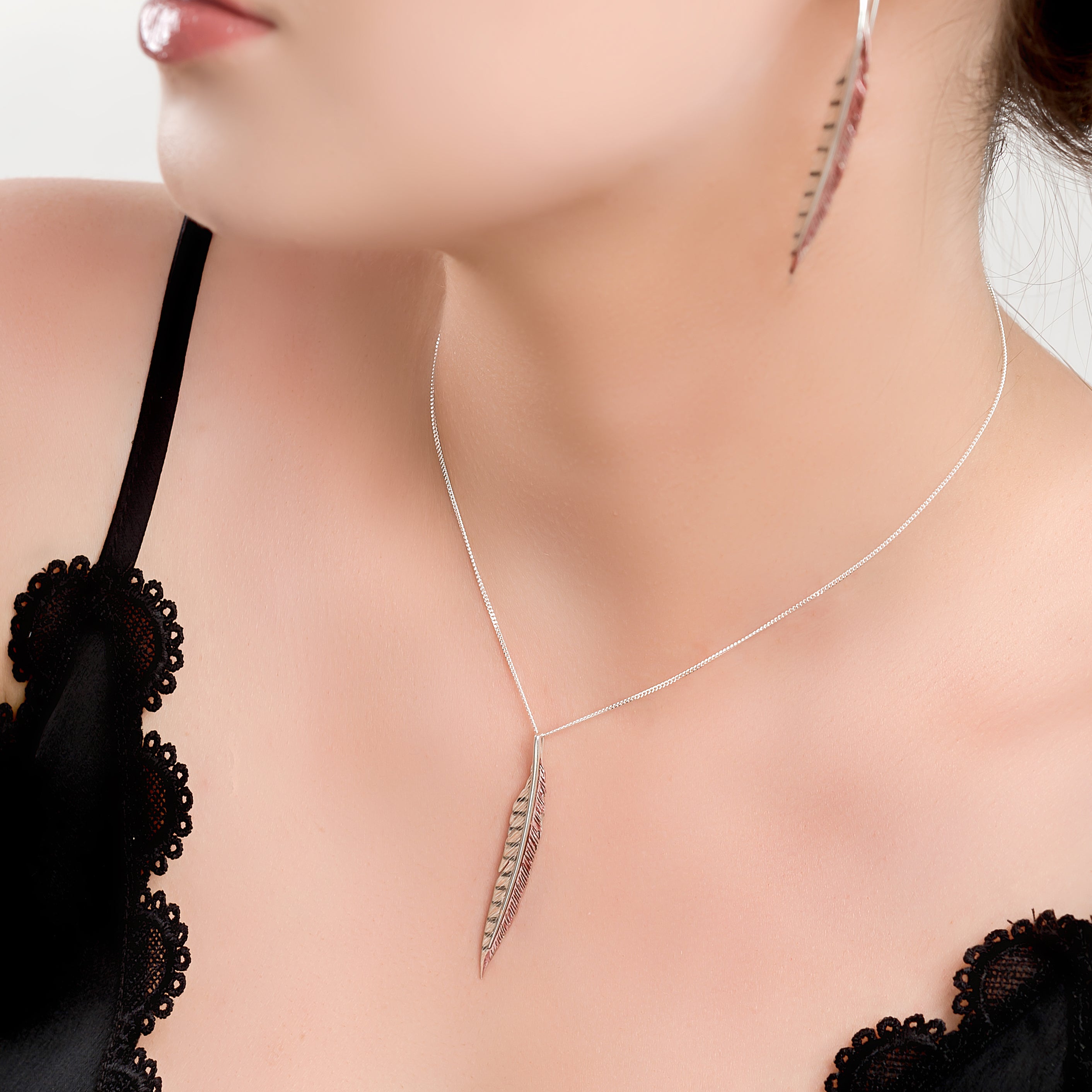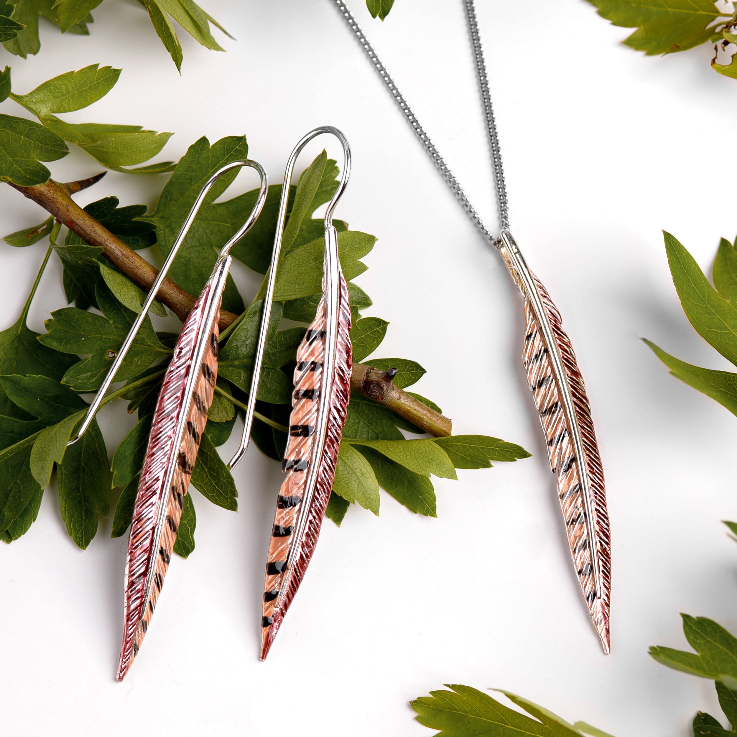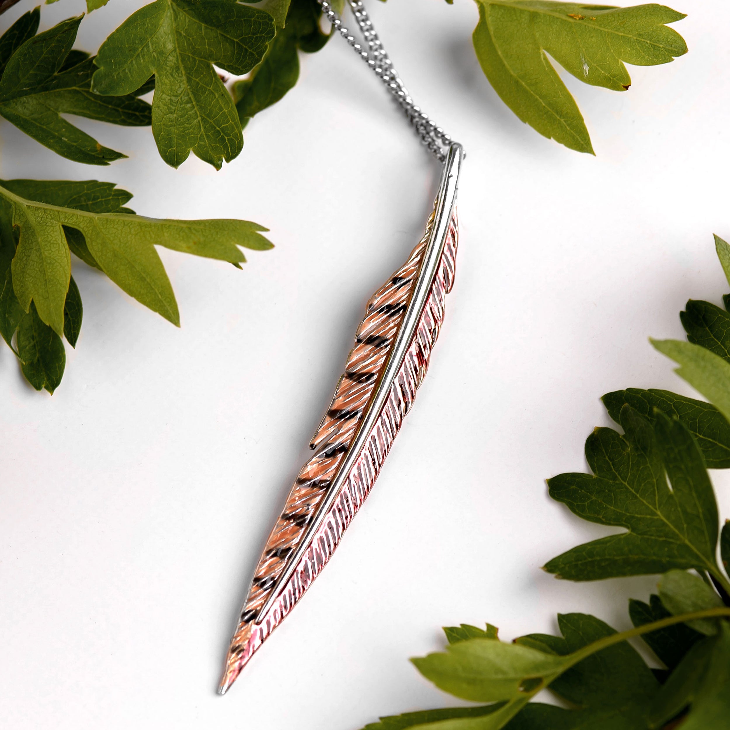 This beautifully hand-painted enamel Silver Pheasant Feather Necklace is ideal for any countryside lover.
