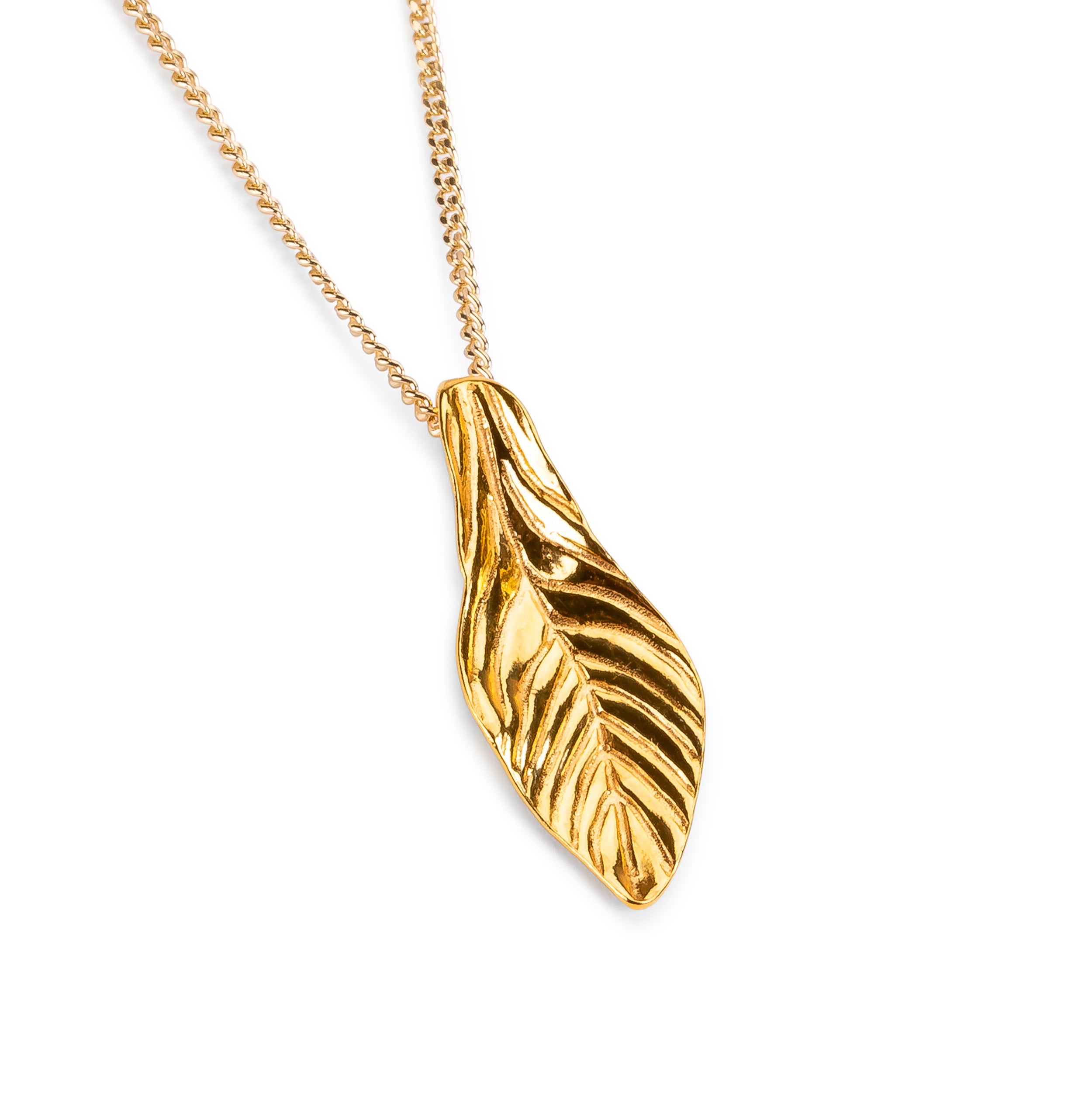 Handcrafted in sterling silver with 24ct gold plating, this necklace features a simple pointed leaf shape with intricate detailing. Comes complete with a silver gold plated chain.
