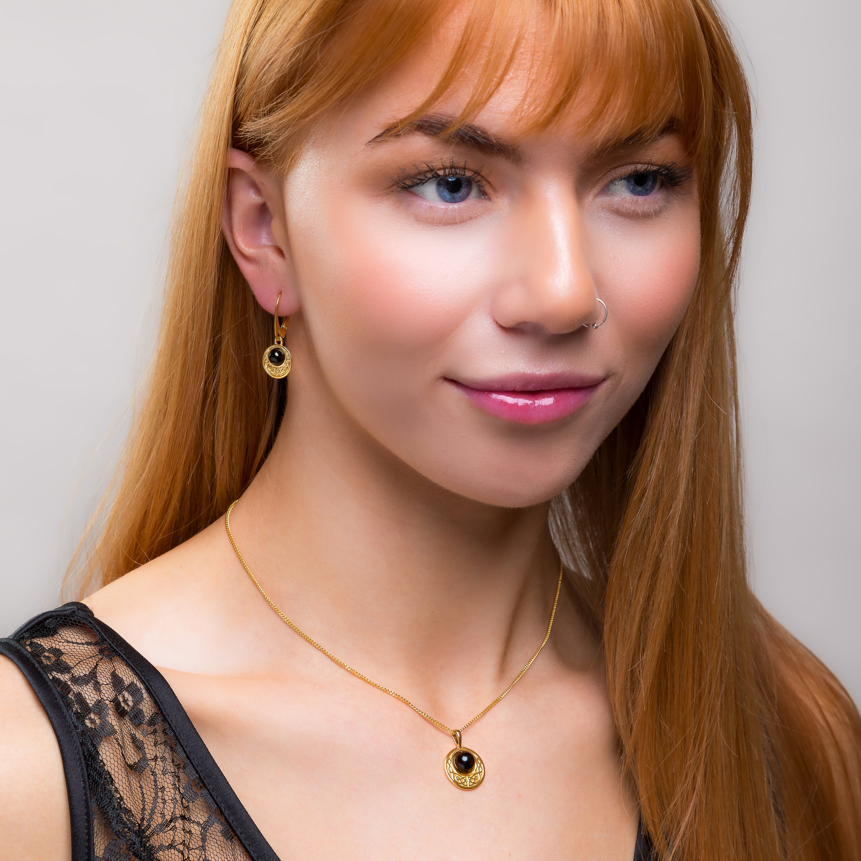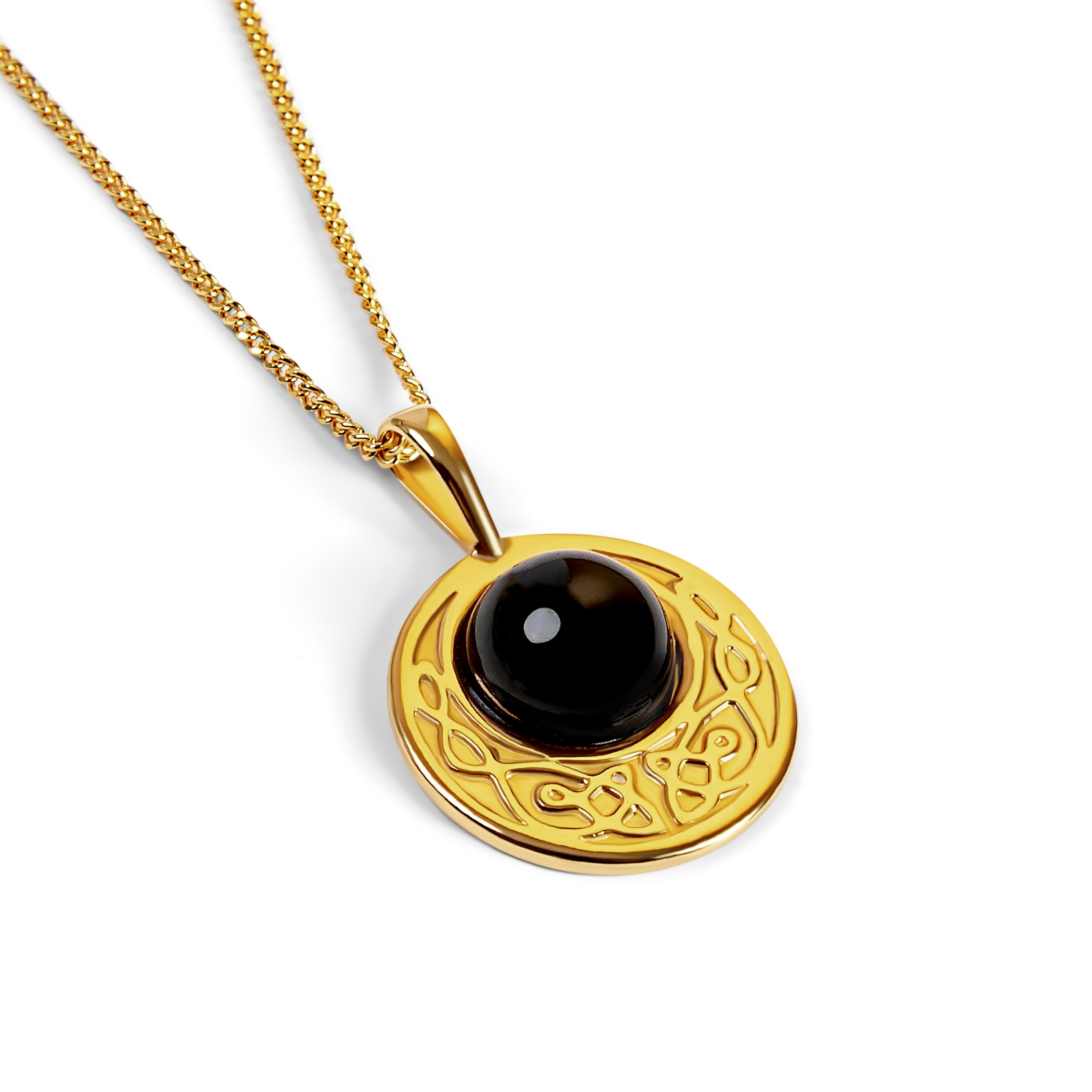 Crafted in 952 silver with 24ct Gold plating, this circle shaped pendant is adorned with a Black Onyx gemstone at the centre. With a Celtic inspired detailing around the stone, it is unique and elegant. Complete with a solid silver gold plated chain, it will be sure to compliment any outfit.