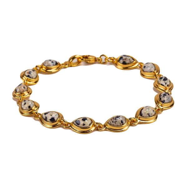 Handcrafted in solid 925 silver with 24ct Gold plating, this bracelet is adorned with 11 natural Dalmatian Jasper gemstones which have been carefully cut and polished into a teardrop shape. Each stone is set and linked together.