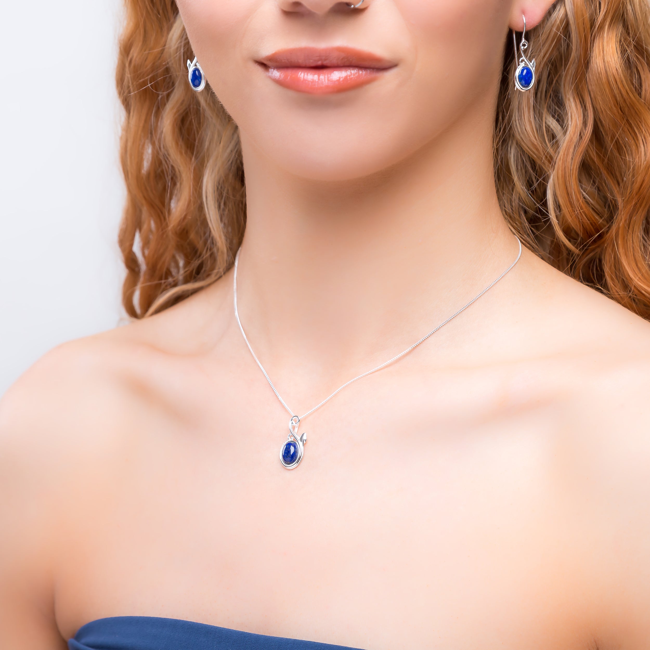 Crafted in 925 silver with carefully cut oval shaped natural Lapis Lazuli gemstone which is surrounded by a pretty leaf design. Complete with a solid silver chain, this necklace hangs perfectly around the neck.