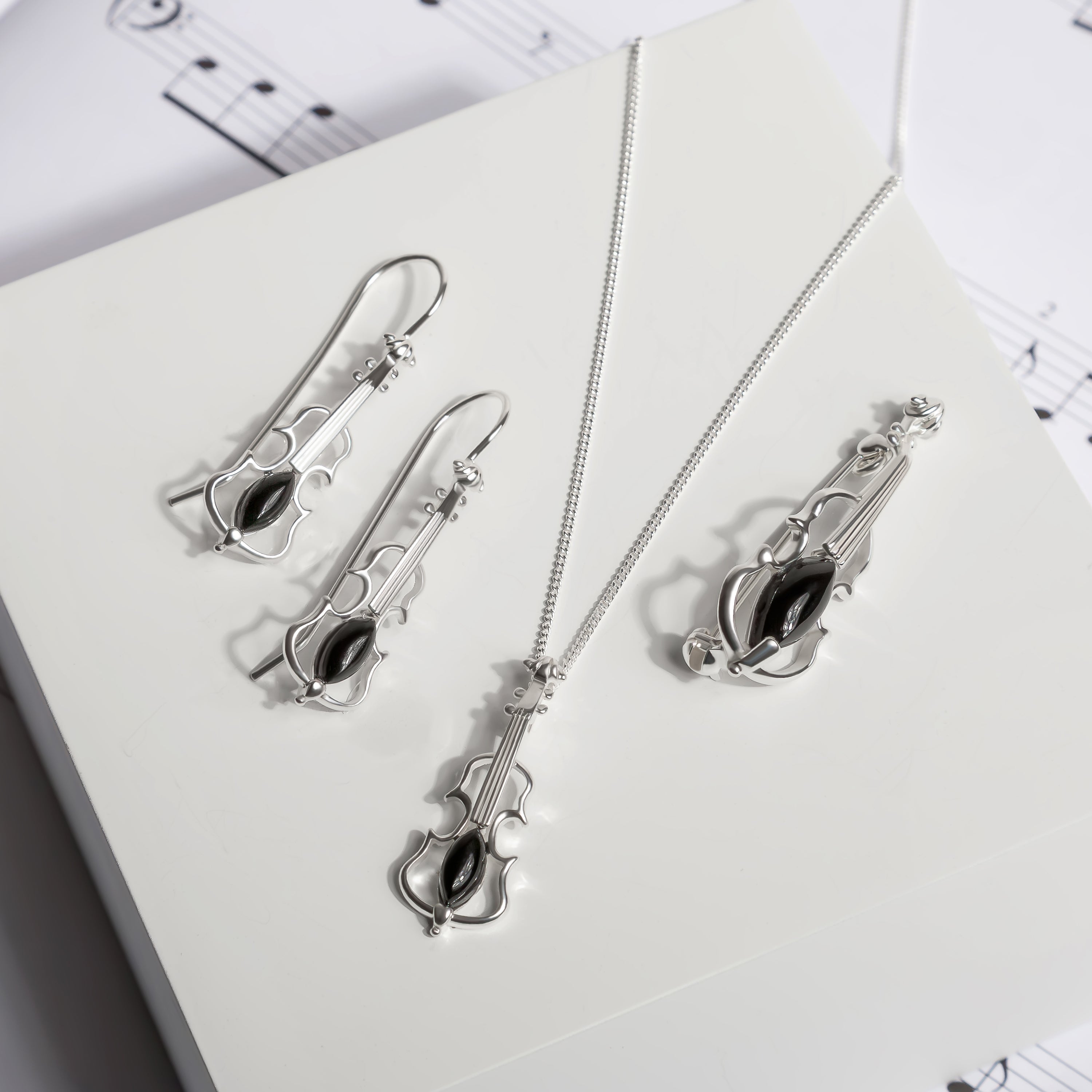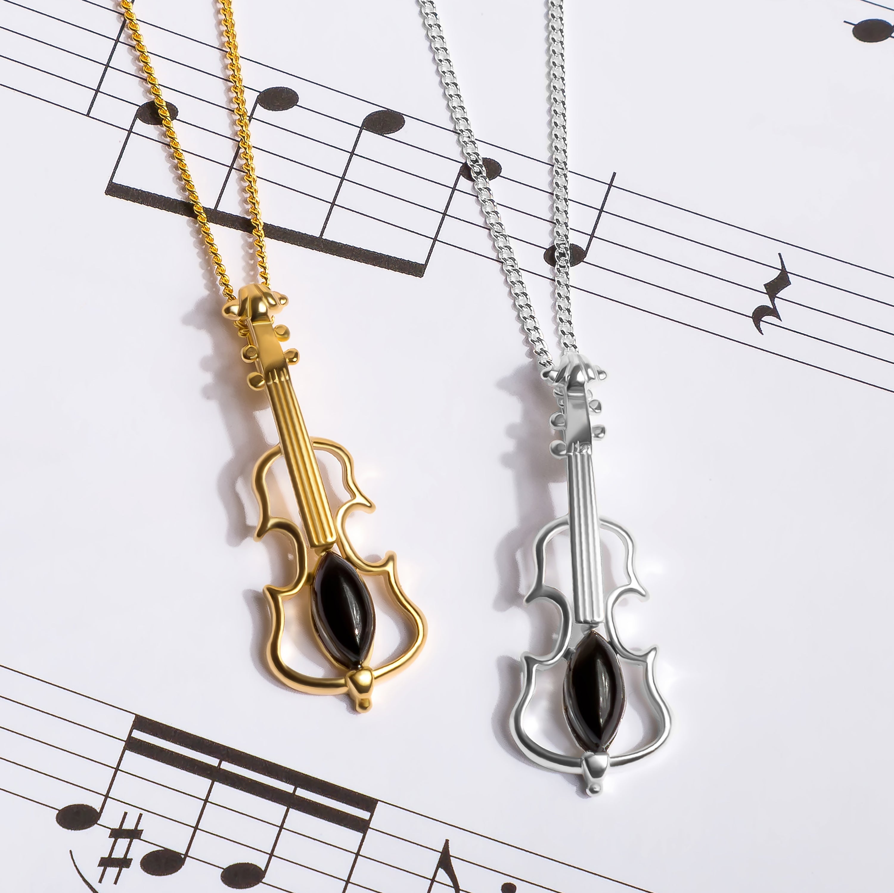 Surprise a player of string instruments with our Silver and Black Onyx Violin Necklace.