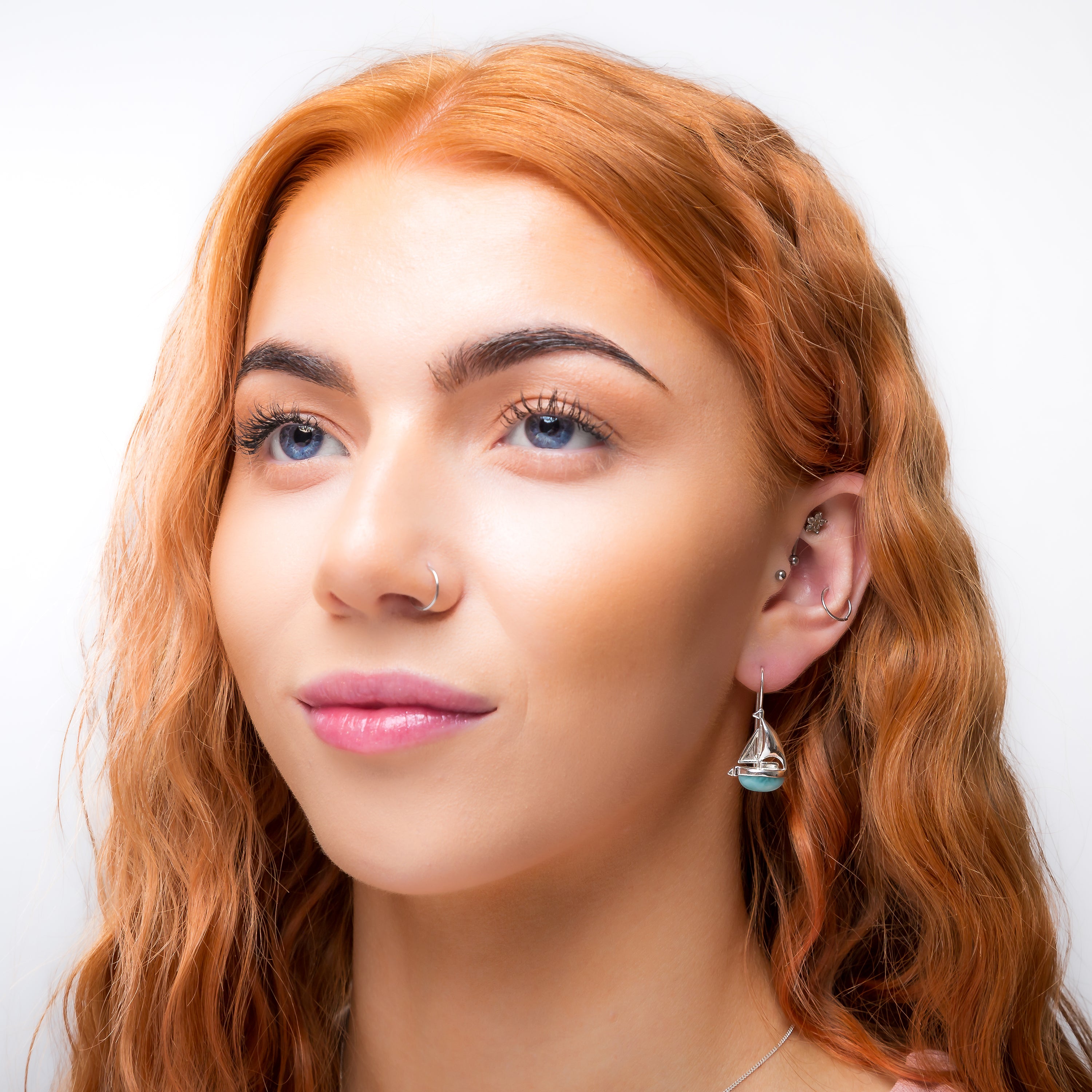 Crafted in 925 silver, each earrings has a natural Larimar gemstone to represent the hull of the boat and is finished with a silver designed sail. Finished with solid silver hooks, these delightful earrings can be worn securely all day long.